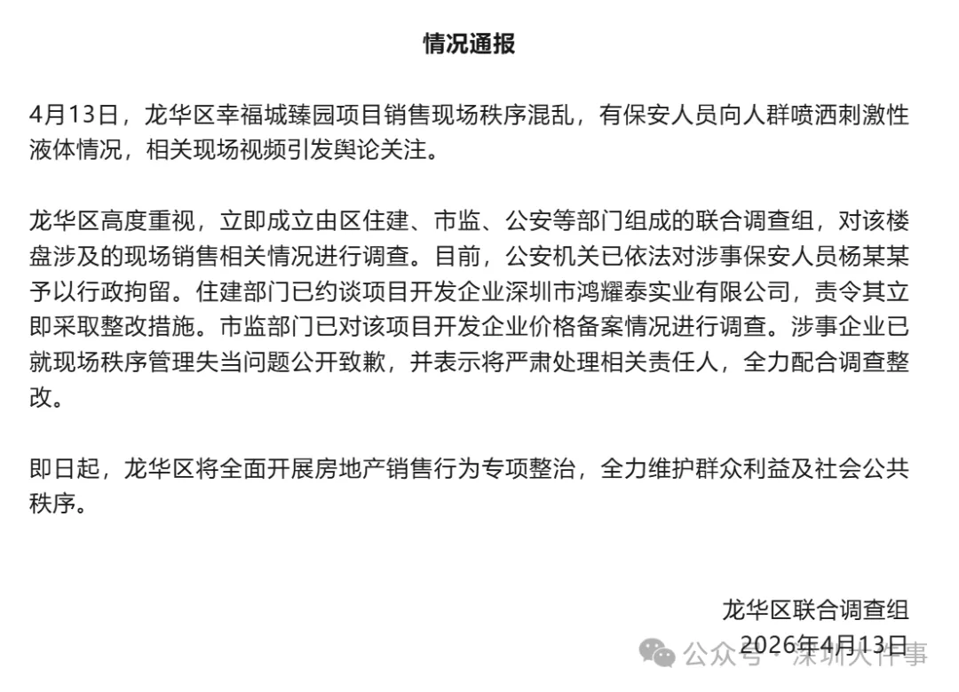 4月13日,龙华区幸福城臻园项目销售现场秩序混乱,有保安人员向人群喷洒刺激性液体情况,相关现场视频引发舆论关注。
