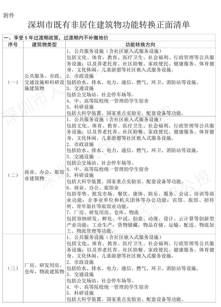 2026年3月26日起,《深圳市既有非居住建筑物功能转换实施办法》正式施行,有效期5年。这项政策的核心是:在不改变土地性质、年限、主体和规划的前提下,允许建筑物功能临时转换,为存量空间松绑。政策实行“正面清单”管理,只有在清单内的建筑,才能申请功能转换。我把复杂的清单简化成大家好理解的两大类: