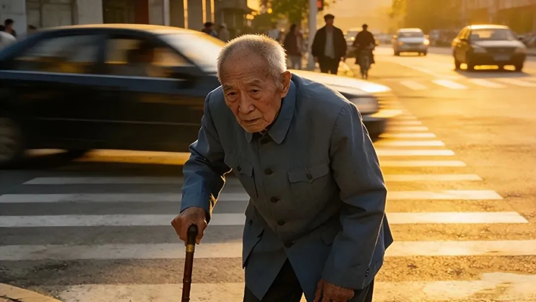 斑马线对面,一位老人慢慢走着。