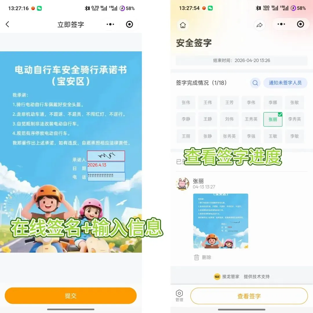 ④ 操作简单,中老年居民也能轻松用:接龙管家的设计就是 “会用手机就会用”,不用学复杂操作,点开链接、签字、提交,三步就完事儿,对不太熟悉智能手机的长辈也很友好。
