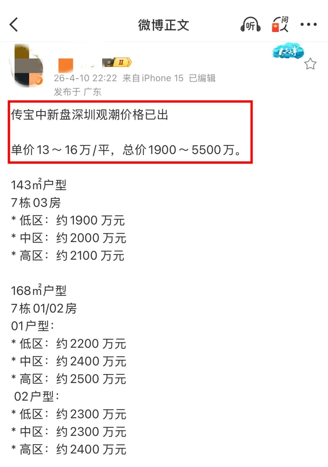 热度之下,深圳核心区新盘已悄然开启“涨价模式”,带头的正是顶豪深圳湾沄玺——3月份加推的216-426平户型,备案均价约17.65万/㎡,相比首期上涨约0.77万/㎡,上车门槛提高约17万,即便涨价,依旧交出百亿热销成绩,重塑了核心豪宅的价格预期。