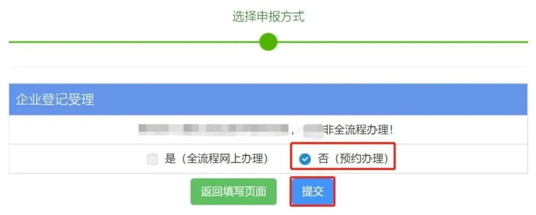 第一步:非全流程办理,选择“否(非全流程,预约) ”, 点击“提交 ”。
