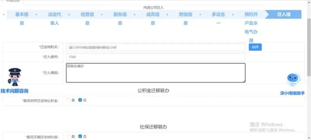第九步:迁入信息填写。用户需填写迁出地机关、迁入涵号、迁入原因。若选择公积金迁移联办,会封存迁出地公积金;若选择社保迁移联办,会注销迁出地社保。