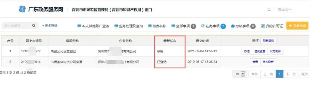 经办人可登录商事主体登记注册系统查询审核结果,最新状态对应以下情况: