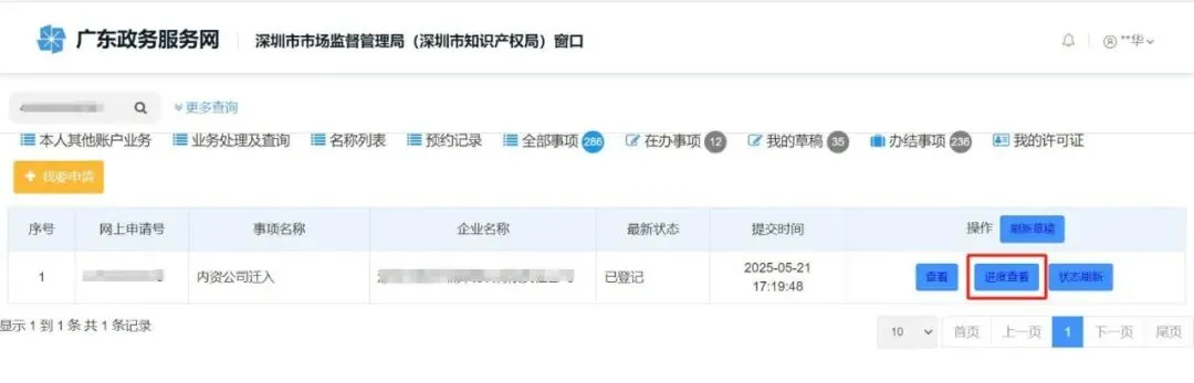 - “ 审批通过 ”状态显示为:已登记。可查看迁移联办结果。可领取营业执照。
