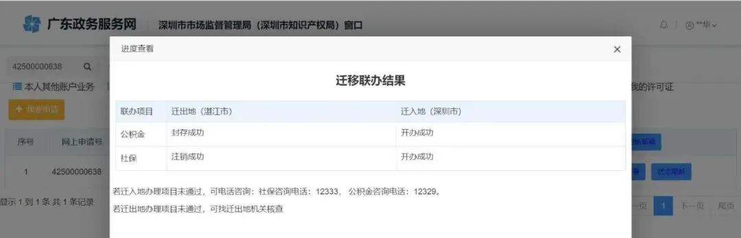 点击“进度查看 ”按钮,显示迁移联办结果。
