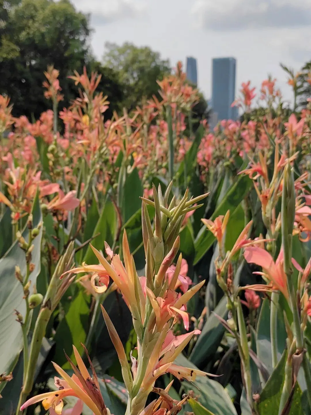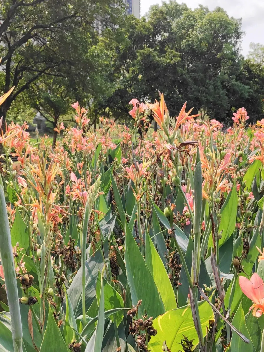 走着走着发现前边有两块正在盛开的美人蕉。好美呀。想看朱顶红变成了看美人蕉。也不错呢。