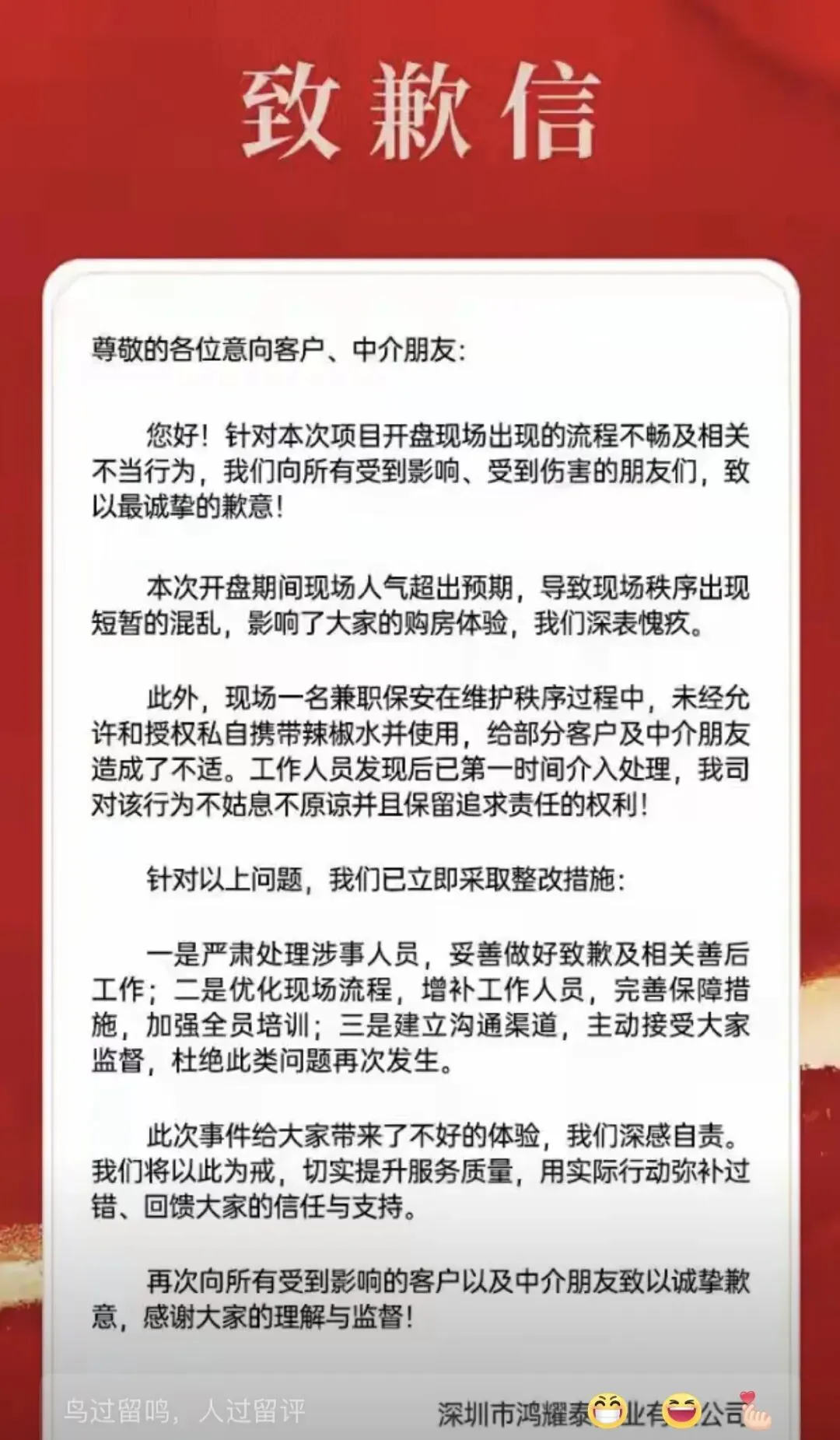 事后开发商轻飘飘发了封致歉信,把所有责任推给兼职保安,试图草草了事。