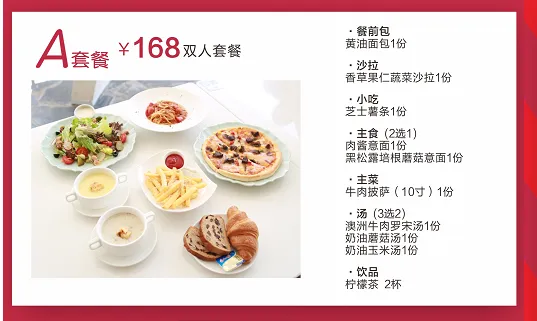 168元牛肉鼓萨双人餐包含:黄油面包1份+香草果仁蔬菜沙拉1份+肉酱意面/黑松露培根蘑菇意面(2选1)+牛肉鼓萨1份+罗宋汤/蘑菇汤/王米汤(3选2)+芝士著条1份+柠檬茶2杯