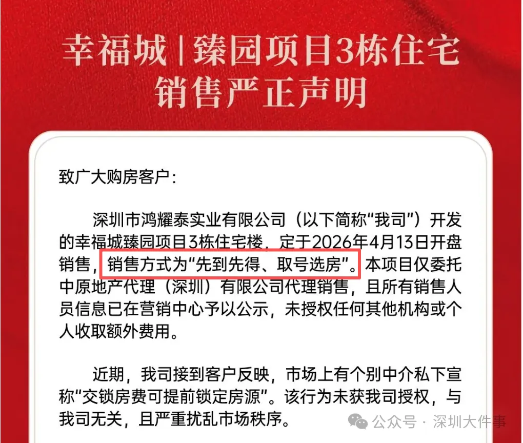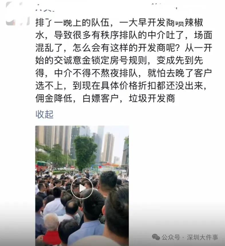 4月13日,龙华中心区幸福城臻园项目3栋产品正式开盘,因开发商采取“先到先得”的销售策略并推出大幅降价房源,引来数百名购房者及中介深夜排队。至次日早晨,现场因人流拥挤发生混乱,一名保安竟使用辣椒水驱散人群,该事件迅速引发市场广泛关注。随后,开发商深圳市鸿耀泰实业有限公司紧急发布致歉信。