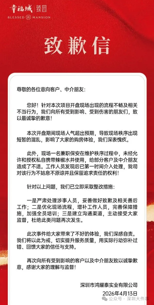 4月13日中午12时许,开发商深圳市鸿耀泰实业有限公司在其官方微信公众号发布致歉信,对事件造成的不良影响向所有受到影响的客户和中介朋友致以最诚挚的歉意。致歉信称,现场人气超出预期导致秩序混乱,涉事保安为兼职人员,其行为未经公司允许和授权。开发商表示,已严肃处理涉事人员,并将优化现场流程、增补工作人员、加强全员培训,杜绝此类事件再次发生。
