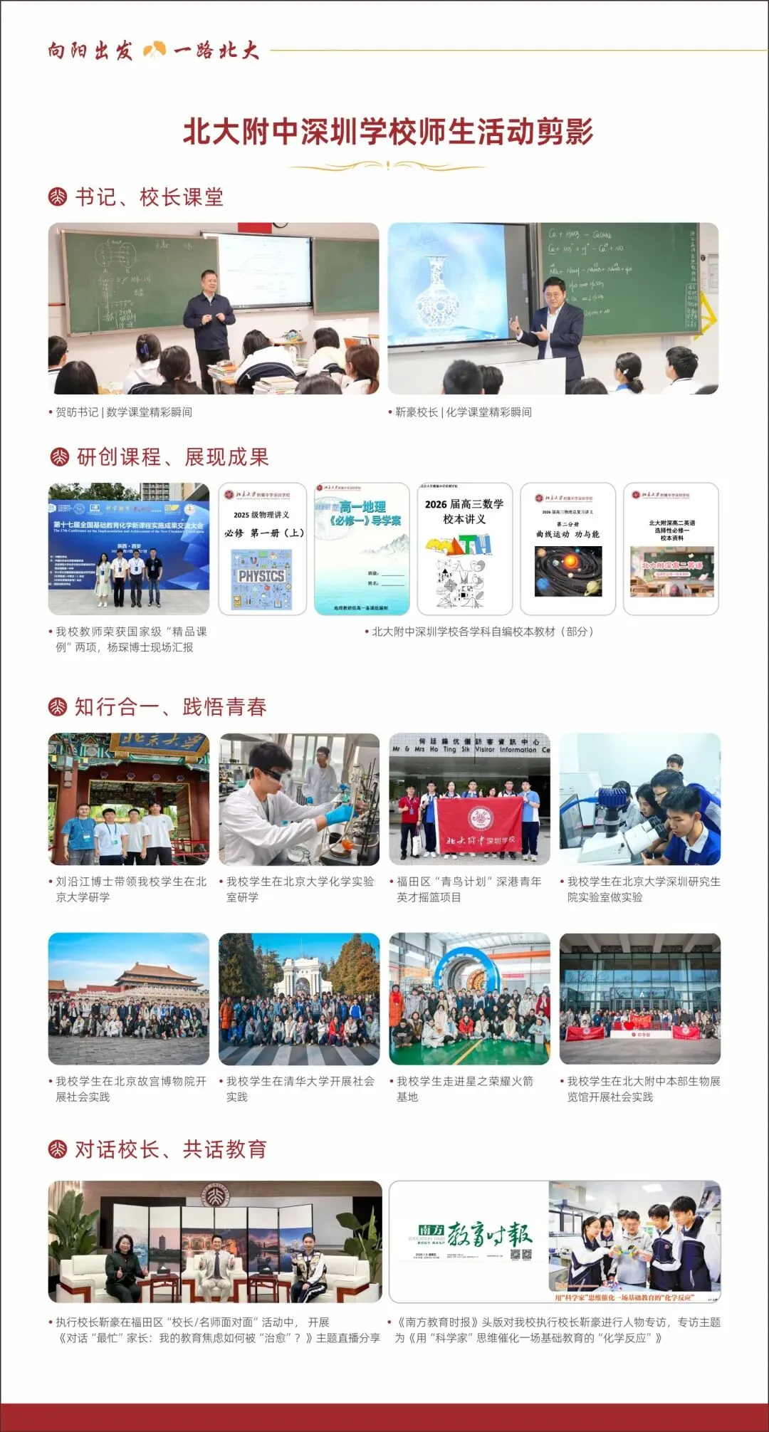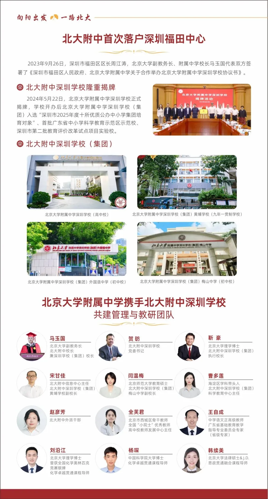 扎根深圳,传承北大精神——北京大学附属中学深圳学校由福田区政府与北大附中联合创办的一所公办寄宿制学校。2024年9月开学,高中部位于福田中心区。办学以来发展迅猛,2025年中考ACD类合计招生525人,录取排名较2024年跃升11位。