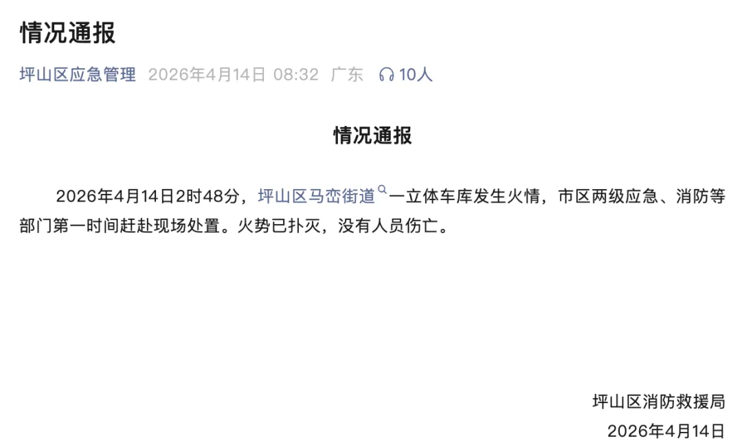 据坪山区应急管理公众号:2026年4月14日2时48分,坪山区马峦街道一立体车库发生火情,市区两级应急、消防等部门第一时间赶赴现场处置。火势已扑灭,没有人员伤亡。