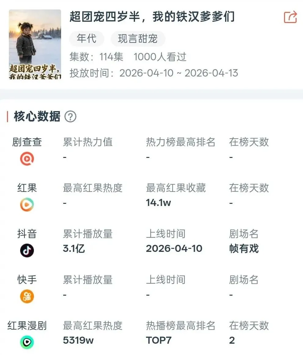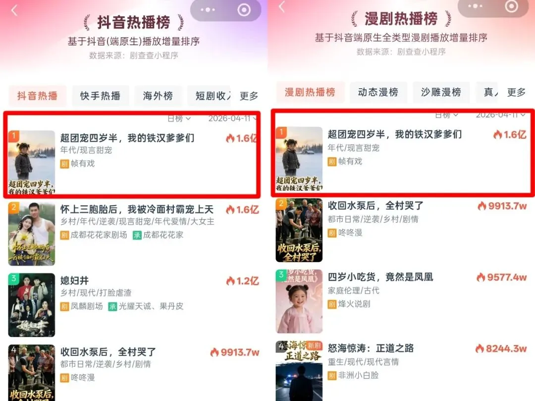 4月12日,DataEye剧查查数据显示,深圳企业不鸣文化自制的团宠题材AI仿真人剧《超团宠四岁半,我的铁汉爹爹们》(以下简称《超团宠四岁半》),同时登顶DataEye抖音热播榜与DataEye漫剧热播榜,单日播放增量超1.6亿!《超团宠四岁半》聚焦成长与亲情守护主题,融合团宠、亲情等高热度内容元素,采用AI仿真人技术还原场景与角色,凭借紧凑的剧情与真挚的情感表达,契合短视频平台用户的观看偏好,截至4月13日为止,据DataEye剧查查数据显示,该剧在抖音平台播放总量已超3.1亿。值得关注的是,该剧全集共114集,制作周期仅30天,全剧制作成本约18万元,较传统漫剧制作模式,成本下降幅度超80%,呈现出“低成本、高效率、高热度”的特点。
