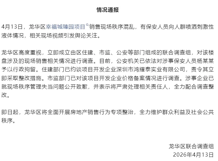 龙华区高度重视,立即成立由区住建、市监、公安等部门组成的联合调查组,对该楼盘涉及的现场销售相关情况进行调查。目前,公安机关已依法对涉事保安人员杨某某予以行政拘留。住建部门已约谈项目开发企业深圳市鸿耀泰实业有限公司,责令其立即采取整改措施。市监部门已对该项目开发企业价格备案情况进行调查。涉事企业已就现场秩序管理失当问题公开致歉,并表示将严肃处理相关责任人,全力配合调查整改。