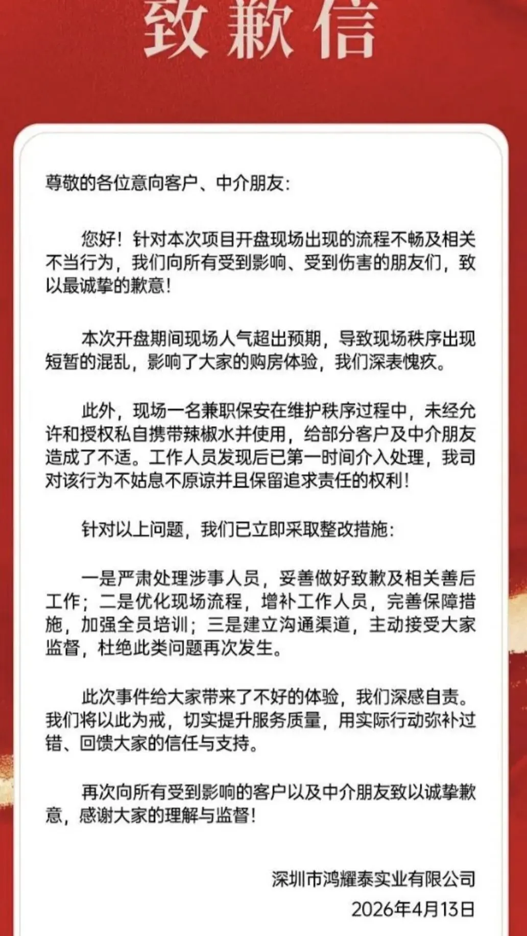 当天中午,开发商深圳市鸿耀泰实业有限公司发布致歉信,称涉事保安是兼职人员,行为未经公司授权,已对其严肃处理,并向受影响的人致歉。