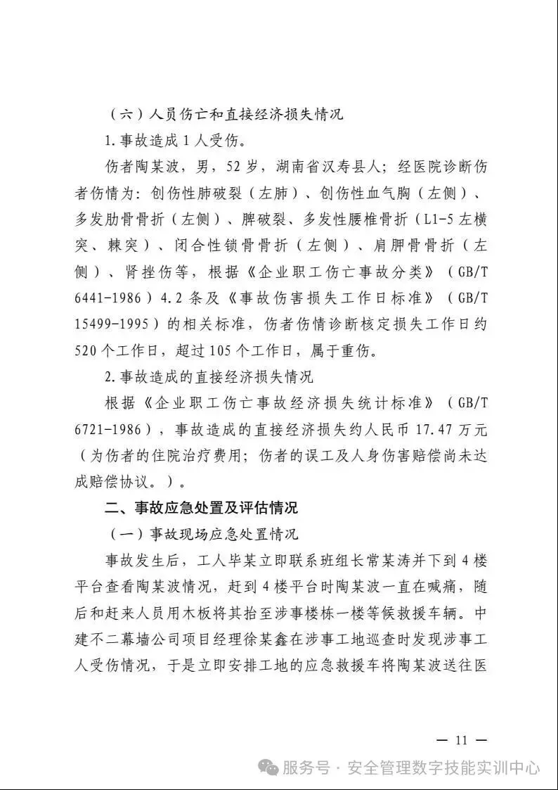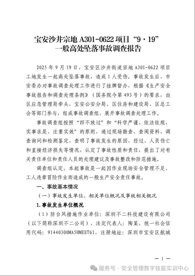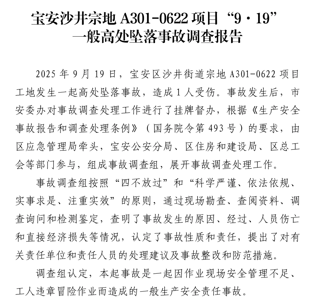 调查报告显示,2025年9月19日,宝安区沙井街道宗地A301-0622项目工地发生一起高处坠落事故,造成1人受伤。