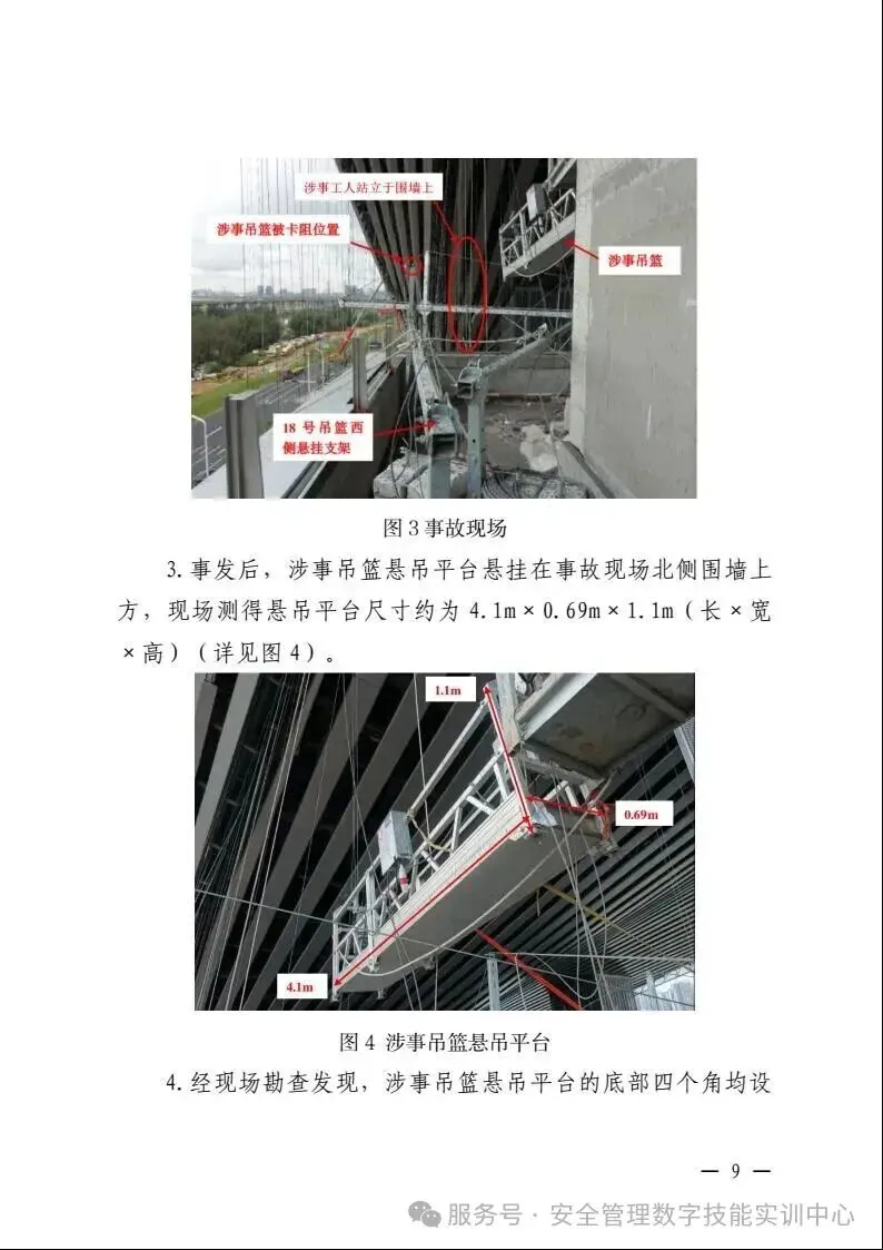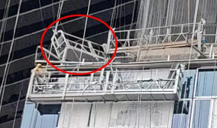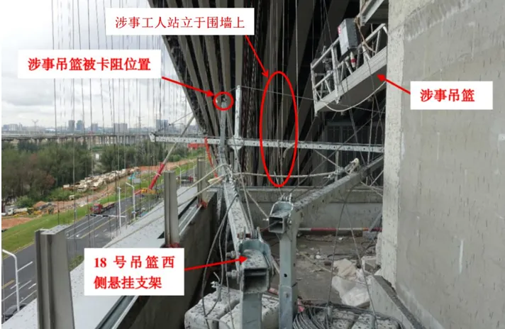 事发前涉事吊篮悬吊平台被卡阻的状况。图源:事故调查报告