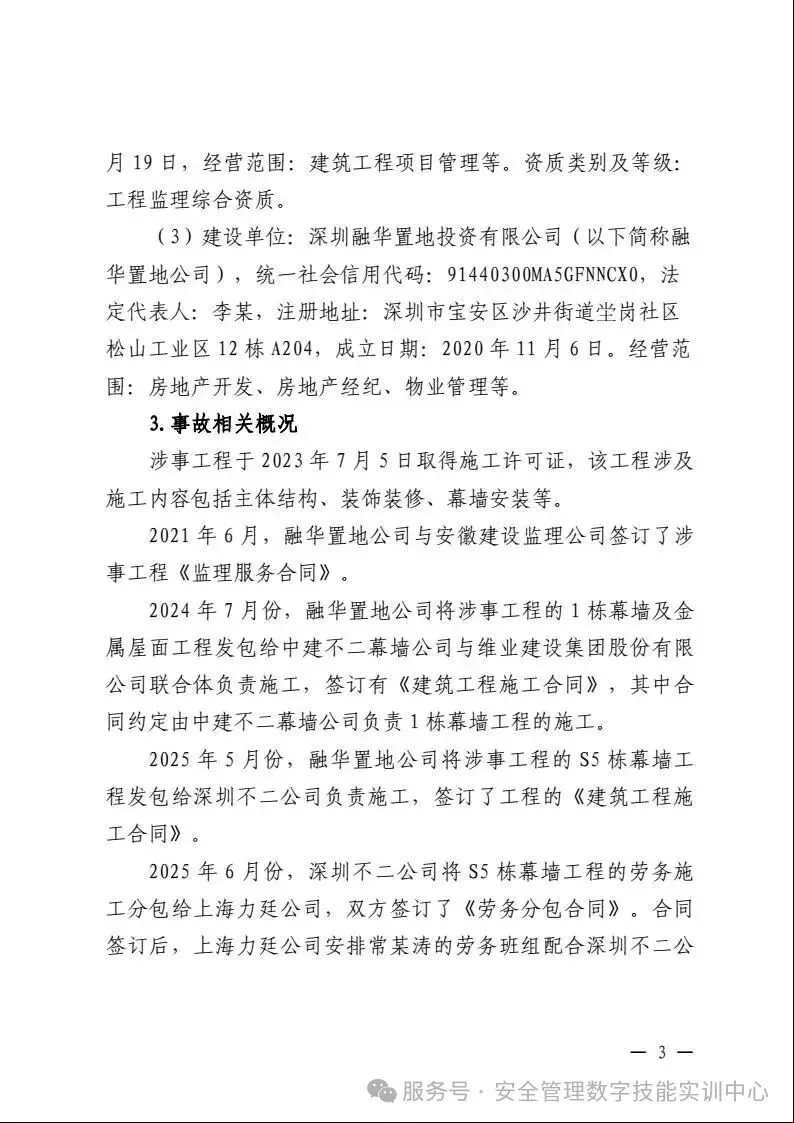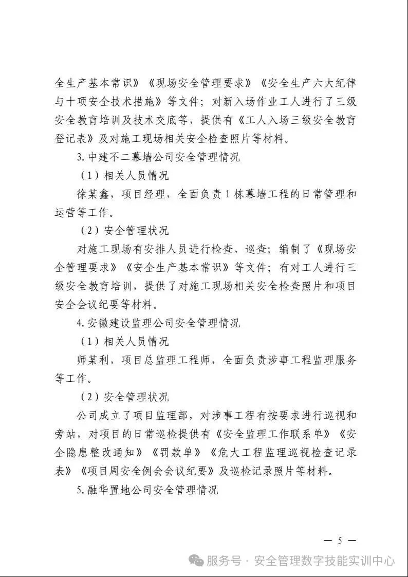 据了解,该项目的相关单位包括:涉事防台风措施作业单位为深圳不二科技建设有限公司(以下简称深圳不二公司);劳务承包单位为上海力廷建筑劳务有限公司(以下简称上海力廷公司);1栋幕墙施工单位为中建不二幕墙装饰有限公司(以下简称中建不二幕墙公司);监理单位为安徽省建设监理有限公司(以下简称安徽建设监理公司);建设单位为深圳融华置地投资有限公司(以下简称融华置地公司)。
