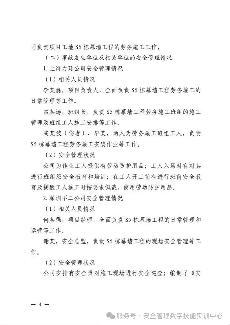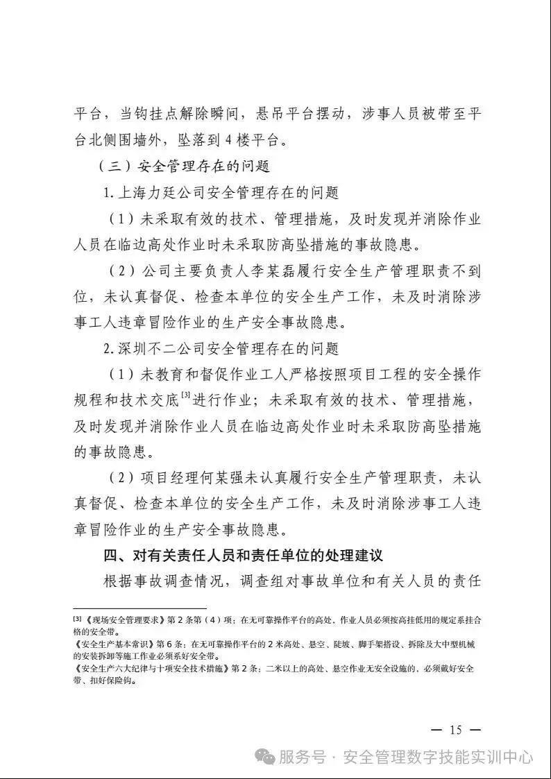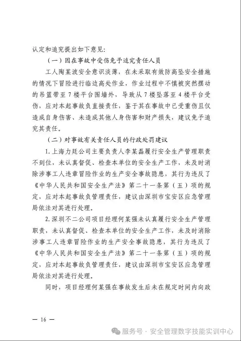 2.深圳不二公司未认真落实安全生产主体责任,未教育和督促作业工人严格按照项目工程的安全操作规程和技术交底进行作业;未采取有效的技术、管理措施,及时发现并消除作业人员在临边高处作业时未采取防高坠措施的事故隐患,应对本起事故负管理责任,建议由深圳市宝安区应急管理局依法对其进行处理。
