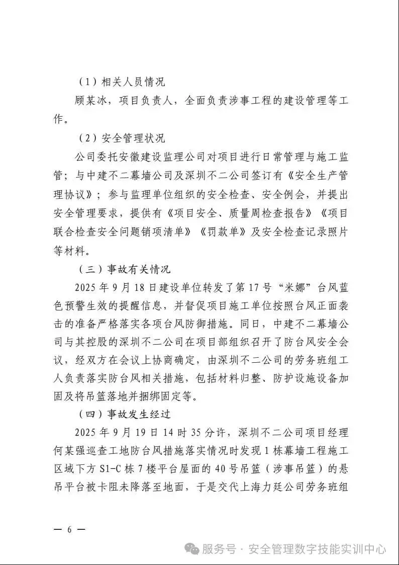 调查报告显示,2025年9月18日建设单位转发了第17号“米娜”台风蓝色预警生效的提醒信息,并督促项目施工单位按照台风正面袭击的准备严格落实各项台风防御措施。
