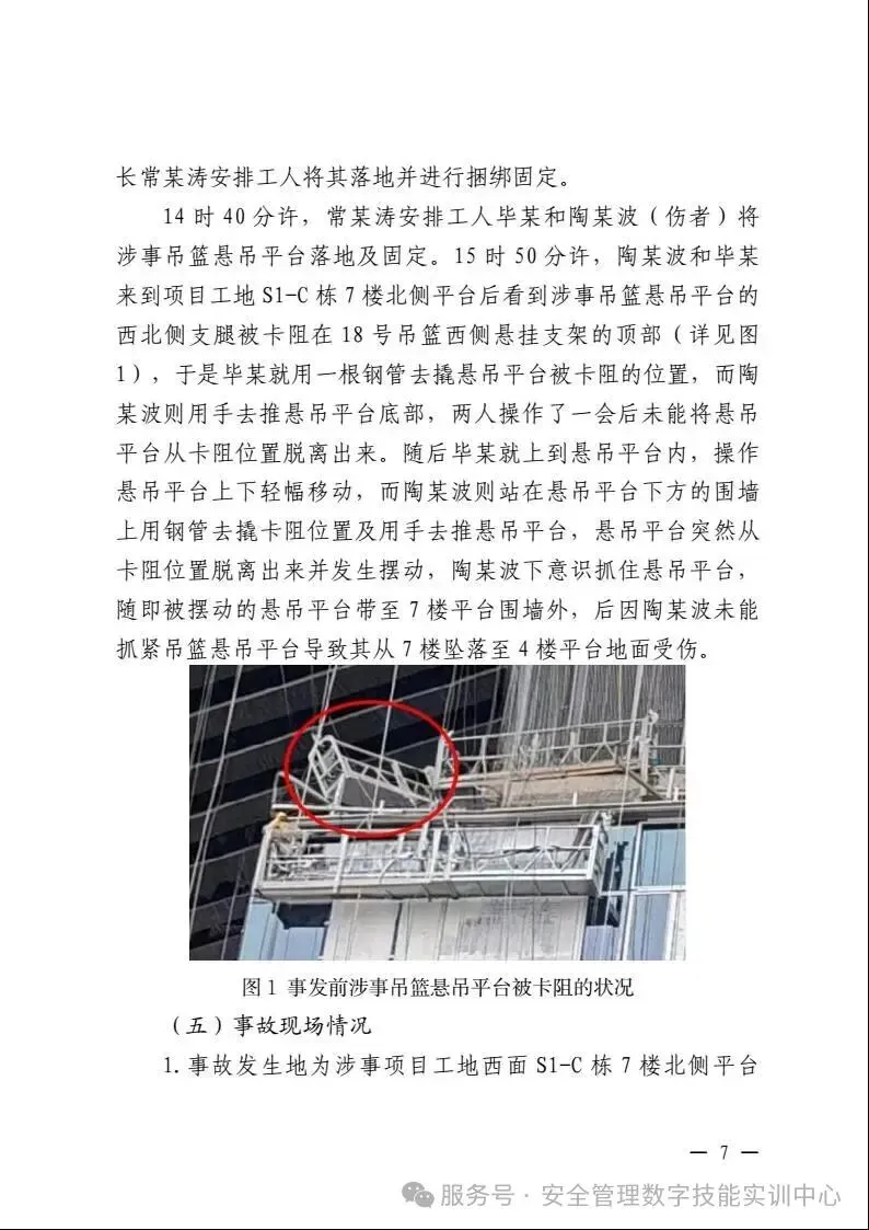 随后毕某就上到悬吊平台内,操作悬吊平台上下轻幅移动,而陶某波则站在悬吊平台下方的围墙上用钢管去撬卡阻位置及用手去推悬吊平台,悬吊平台突然从卡阻位置脱离出来并发生摆动,陶某波下意识抓住悬吊平台,随即被摆动的悬吊平台带至7楼平台围墙外,后因陶某波未能抓紧吊篮悬吊平台导致其从7楼坠落至4楼平台地面受伤。