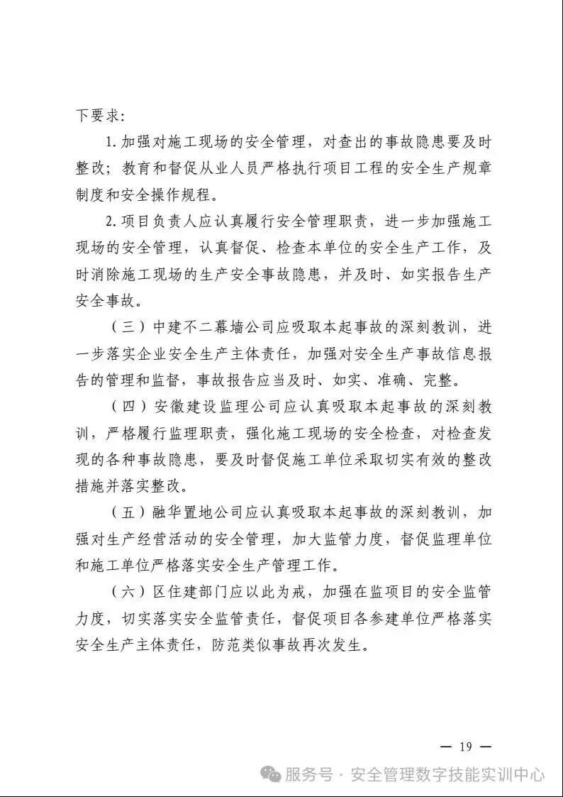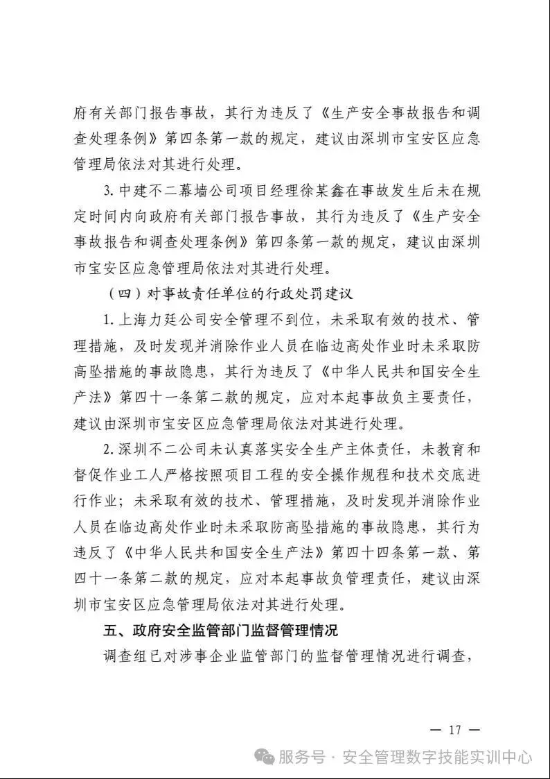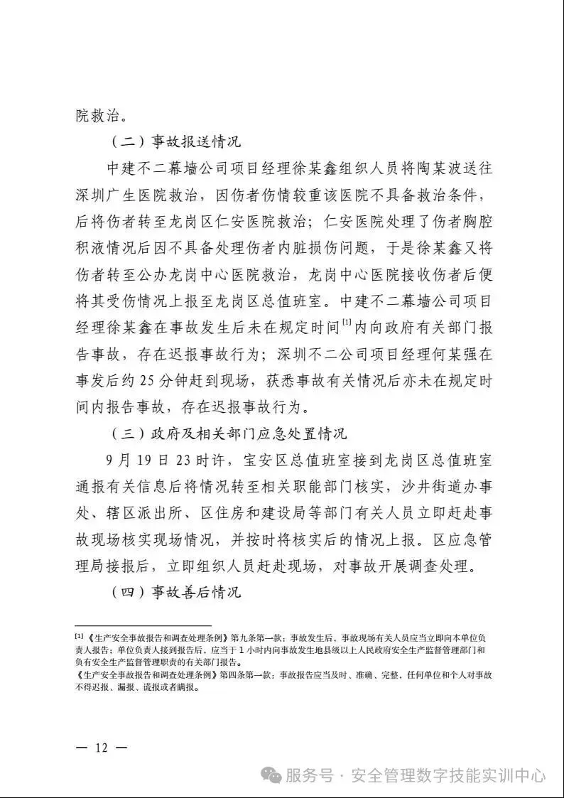 3.中建不二幕墙公司项目经理徐某鑫在事故发生后未在规定时间内向政府有关部门报告,建议由深圳市宝安区应急管理局依法对其进行处理。