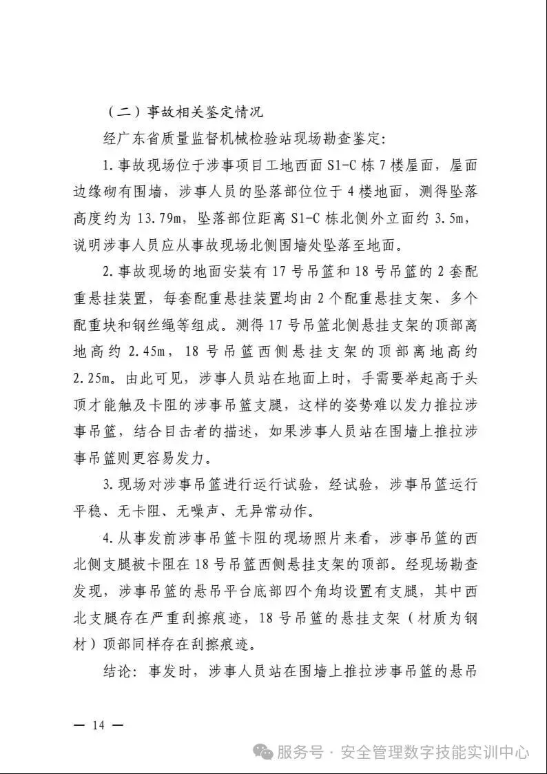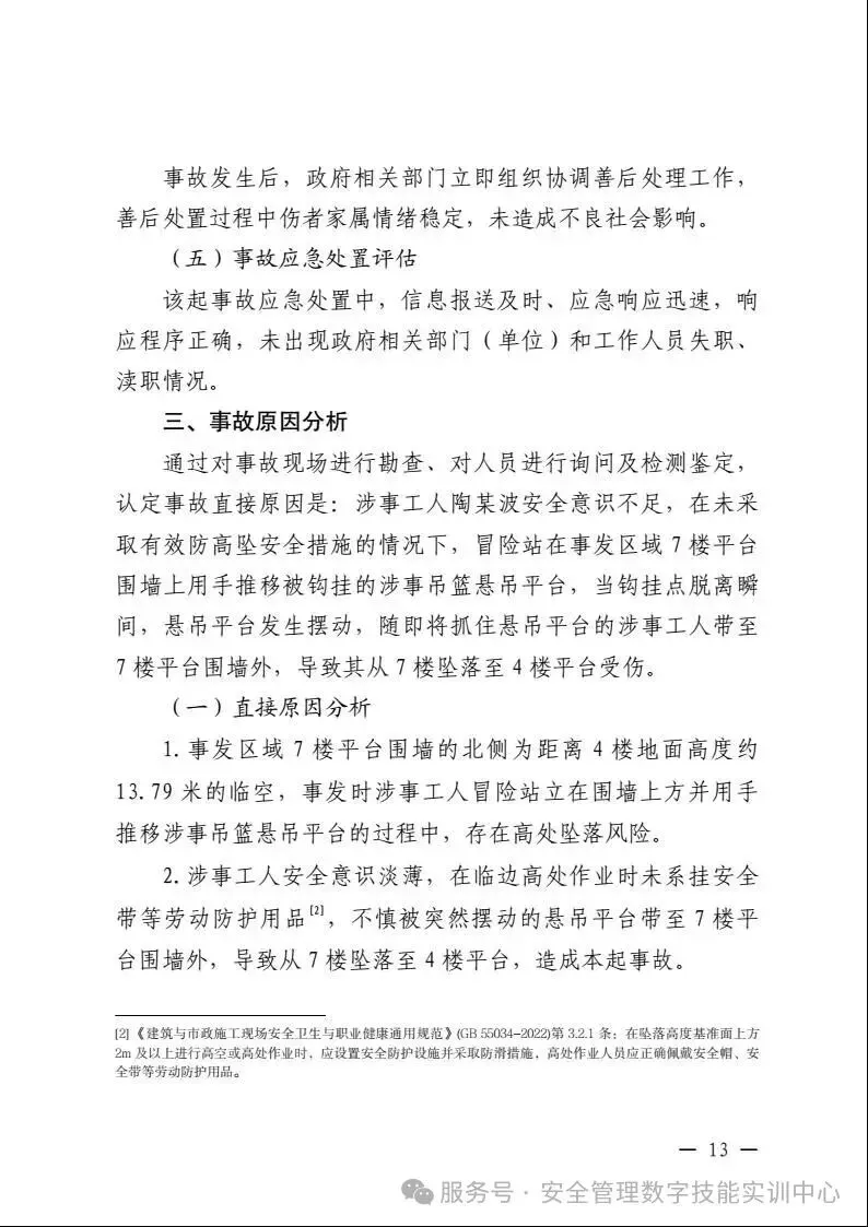 通过对事故现场进行勘查、对人员进行询问及检测鉴定,认定事故直接原因是:涉事工人陶某波安全意识不足,在未采取有效防高坠安全措施的情况下,冒险站在事发区域7楼平台围墙上用手推移被钩挂的涉事吊篮悬吊平台,当钩挂点脱离瞬间,悬吊平台发生摆动,随即将抓住悬吊平台的涉事工人带至7楼平台围墙外,导致其从7楼坠落至4楼平台受伤。