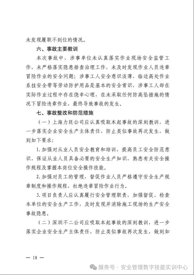 1.上海力廷公司安全管理不到位,未采取有效的技术、管理措施,及时发现并消除作业人员在临边高处作业时未采取防高坠措施的事故隐患,应对本起事故负主要责任,建议由深圳市宝安区应急管理局依法对其进行处理。