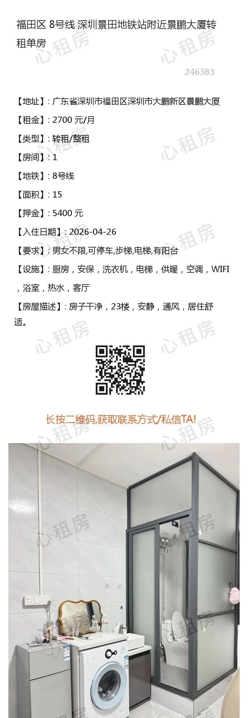 深圳租房【福田2则】房源①:8号线深圳福田景田地铁站附近景鹏大厦转租单房2700元/月;房源②:…