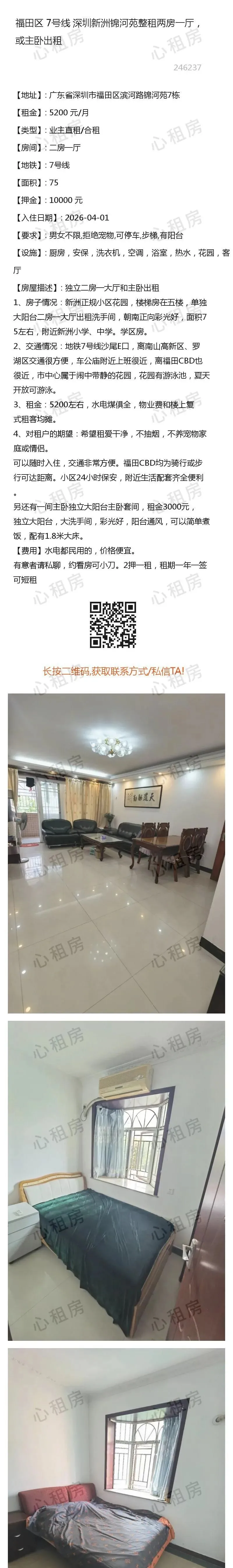 深圳租房>>福田区7号线深圳新洲锦河苑整租两房一厅,或主卧出租5200元/月