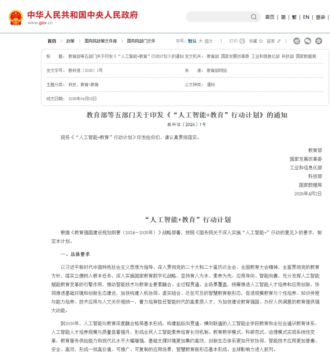 2026年4月2日,教育部、国家发展改革委、工业和信息化部、科技部、国家数据局五部门联合印发《"人工智能+教育"行动计划》。