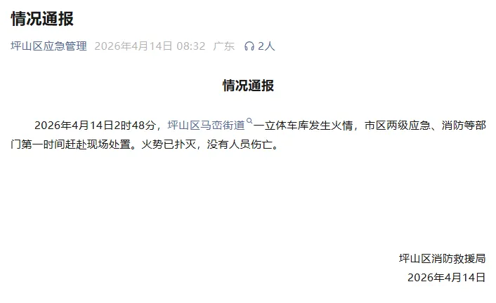 2026年4月14日2时48分,坪山区马峦街道一立体车库发生火情,市区两级应急、消防等部门第一时间赶赴现场处置。火势已扑灭,没有人员伤亡。