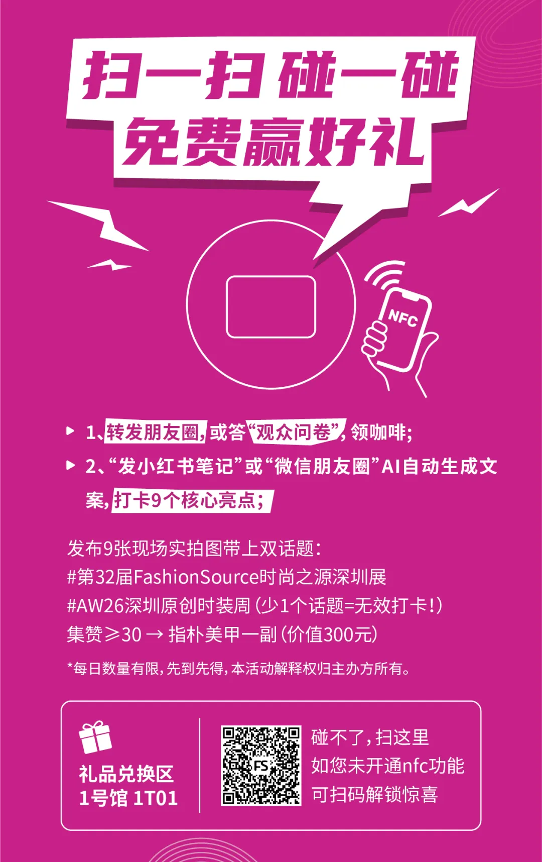 2、发【小红书笔记】或【微信朋友圈】,带上双话题:#第32届FashionSource时尚之源深圳展 #AW26深圳原创时装周(少1个话题=无效打卡!)