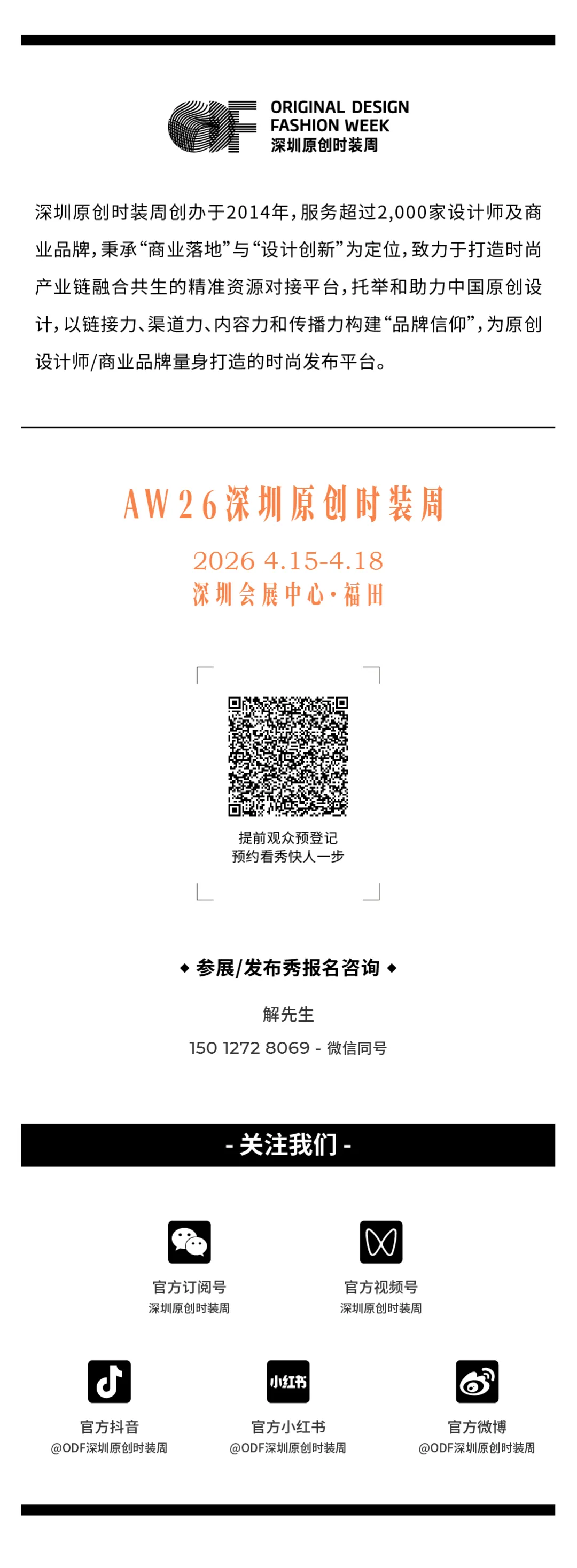 4月15日-18日,AW26深圳原创时装周秀场全程高清直播,点击预约不错过,锁定专属看秀通道!