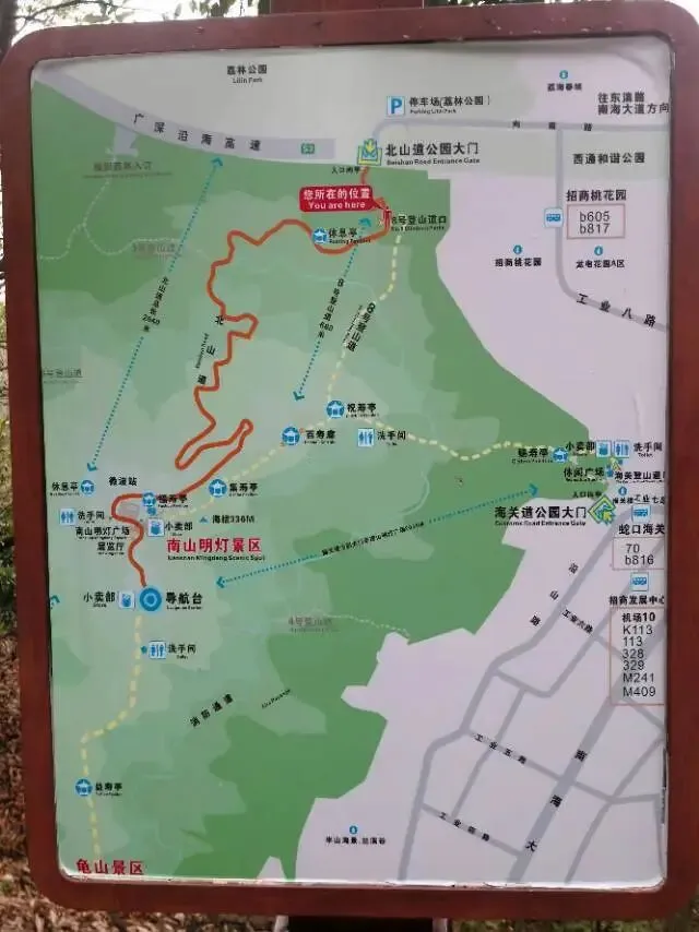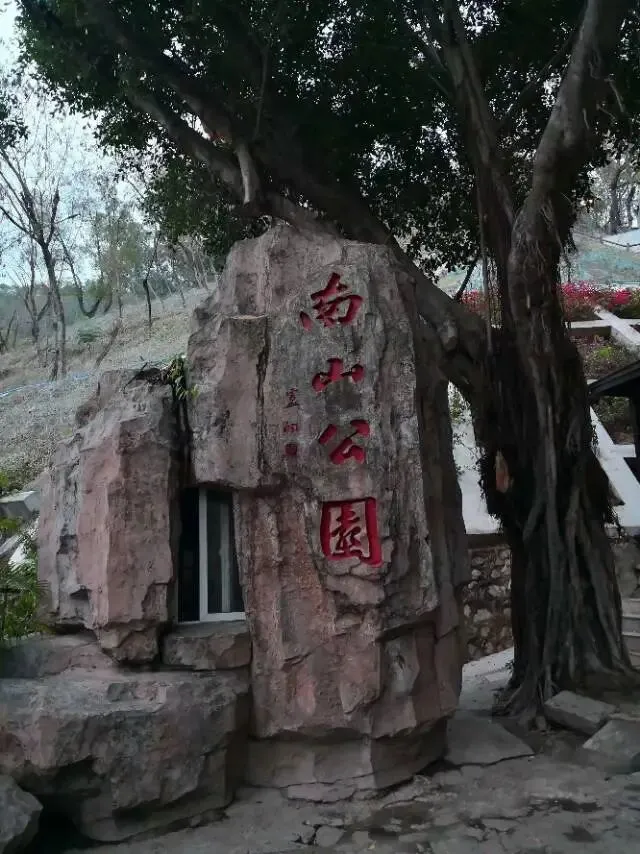 南山公园位于深圳市南头半岛,主峰高336米。山上古树参天,枝繁叶茂,苍翠挺拔,万木争荣。北山门的墙上,镶嵌或雕刻着类似告示之类的牌子,有东说东,有西说西。