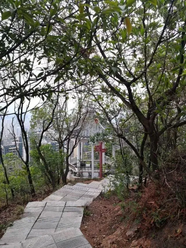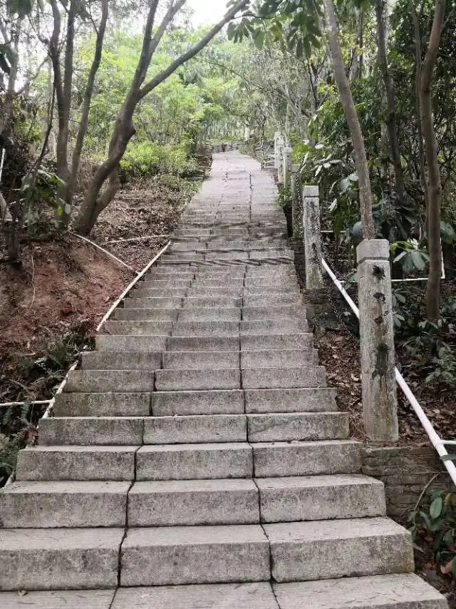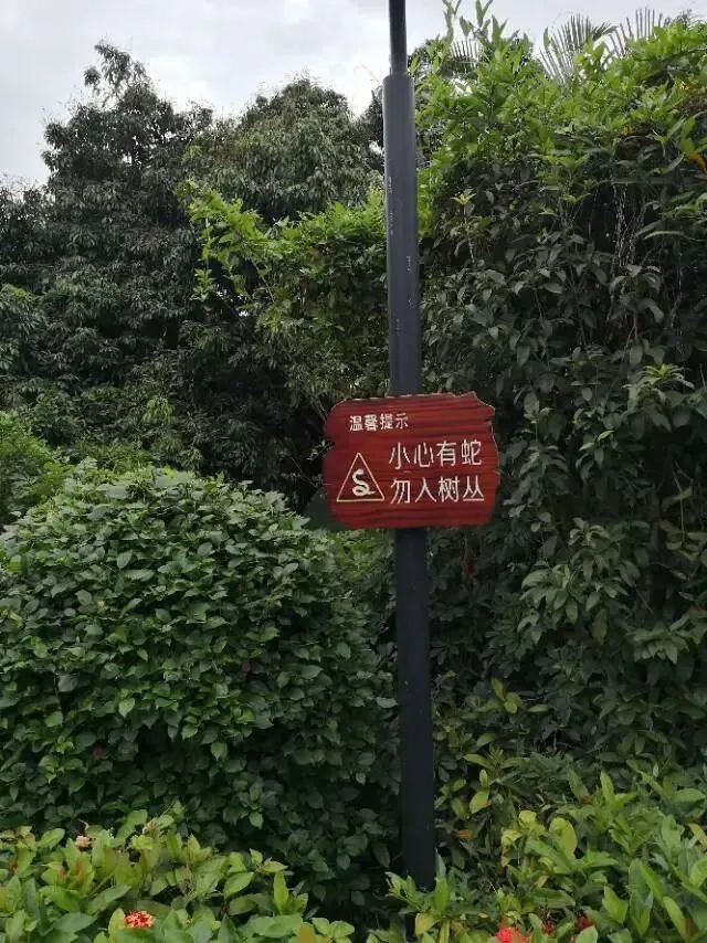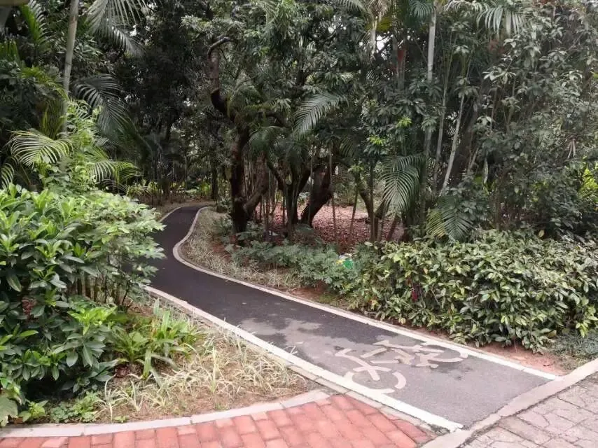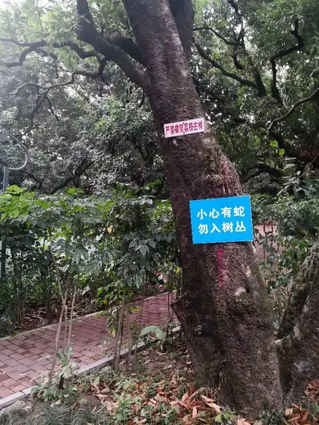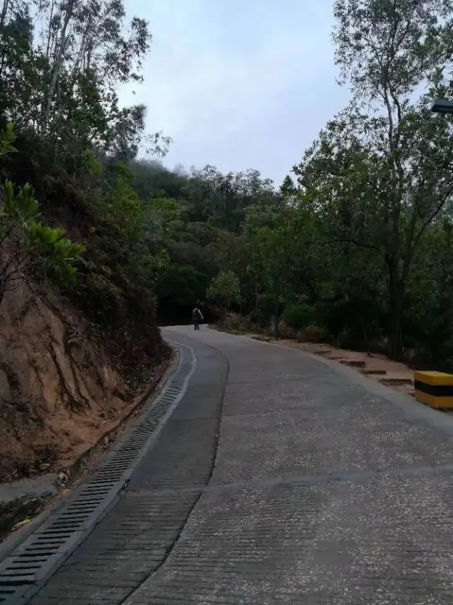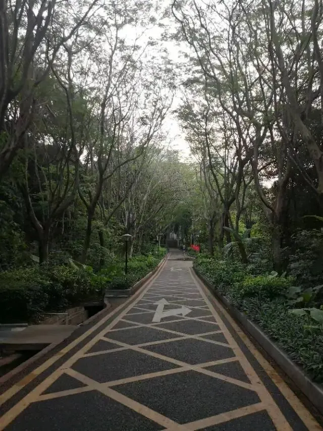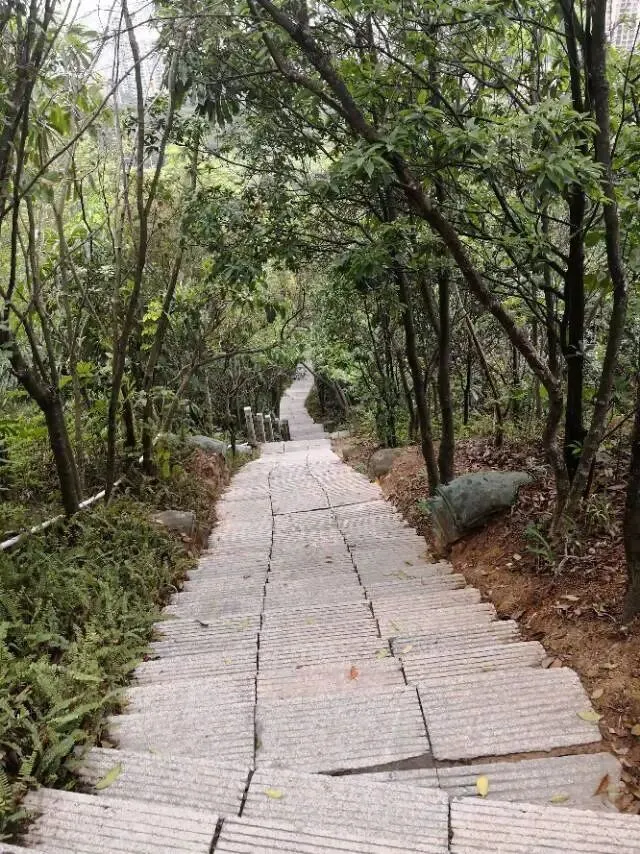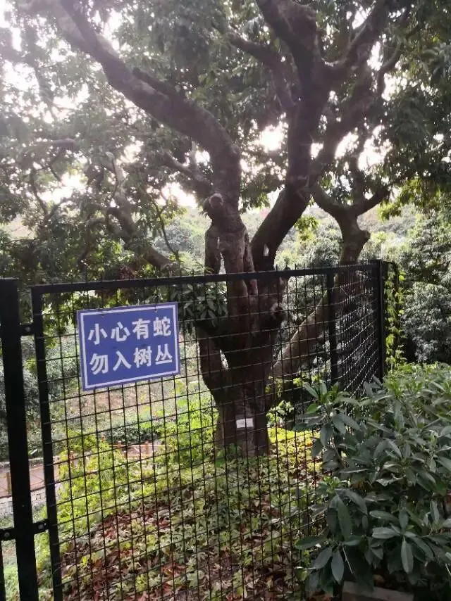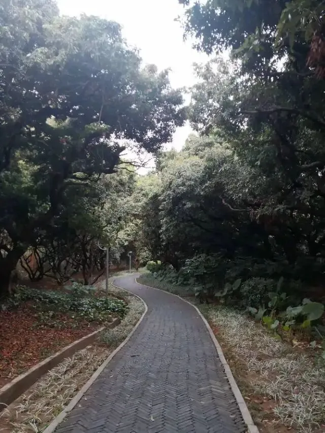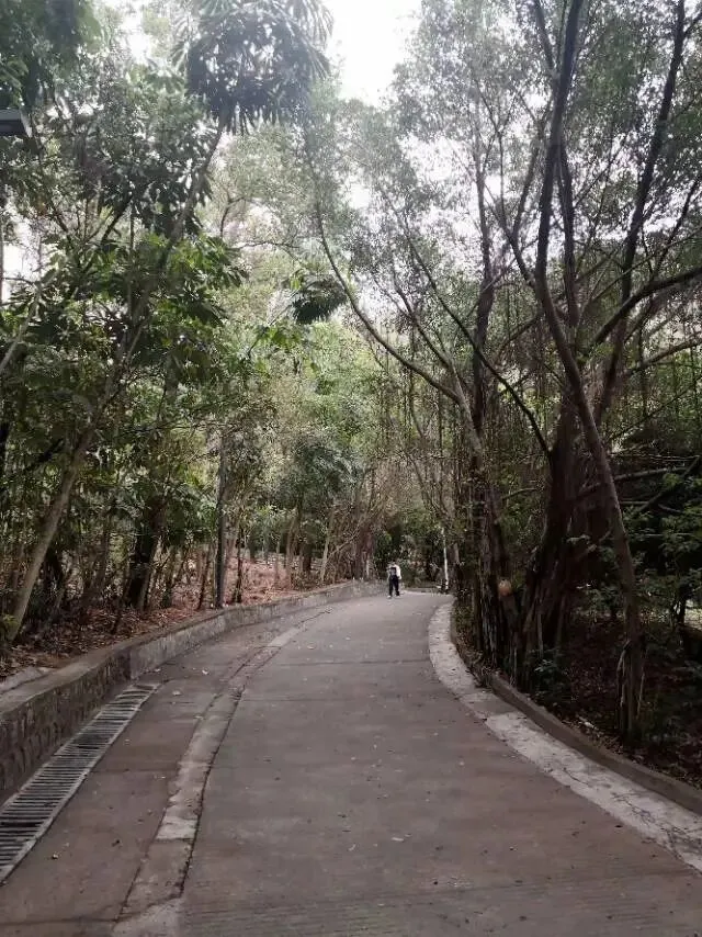 我是穿过荔林公园上山的。“日啖荔枝三百颗,不辞长作岭南人”。公园内植物种类繁多,尤以荔枝为主,浓荫蔽天,掩映成趣。道路阡陌纵横,曲径通幽,青砖铺就的健步道古朴雅致。一条细窄却相对平坦的柏油小路,作为自行车道却也让人赏心悦目。只是间或便能看到的“小心有蛇”的醒目牌,总是让人心有余悸、惴惴不安。