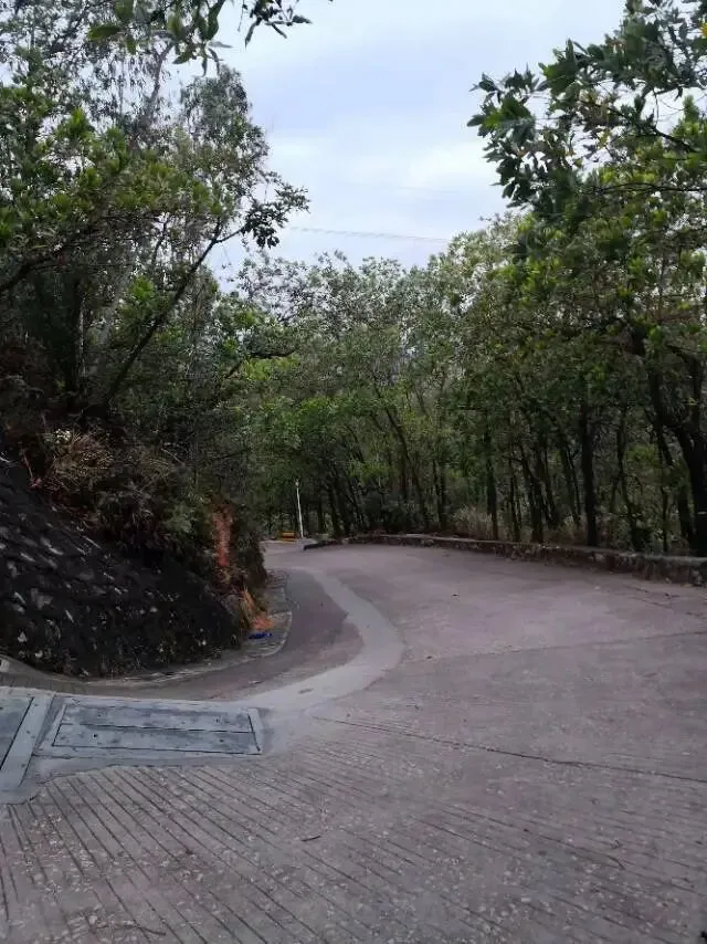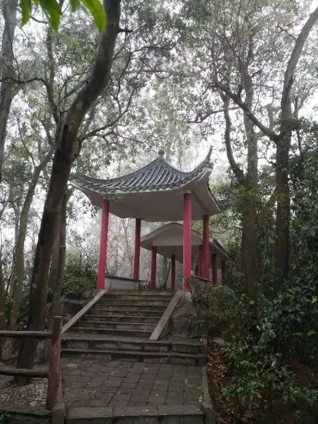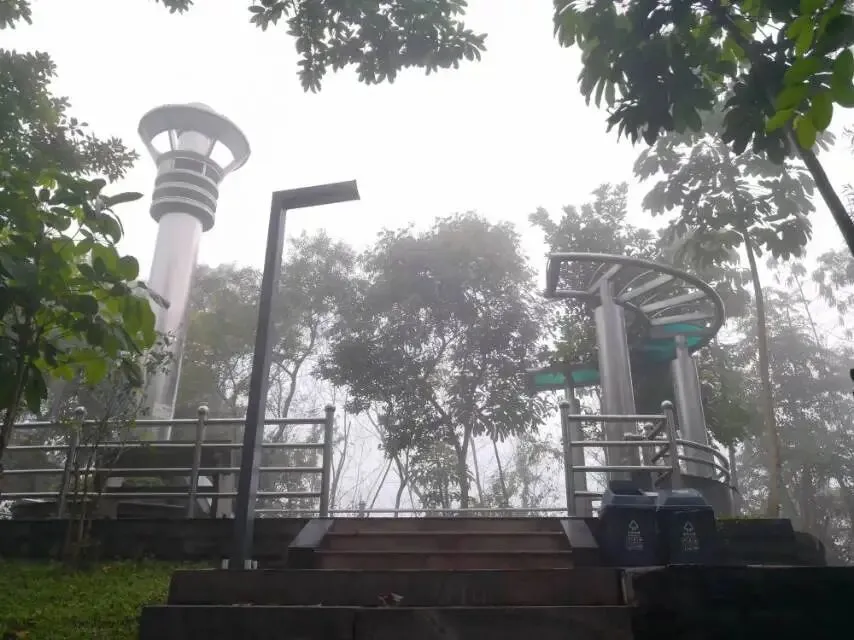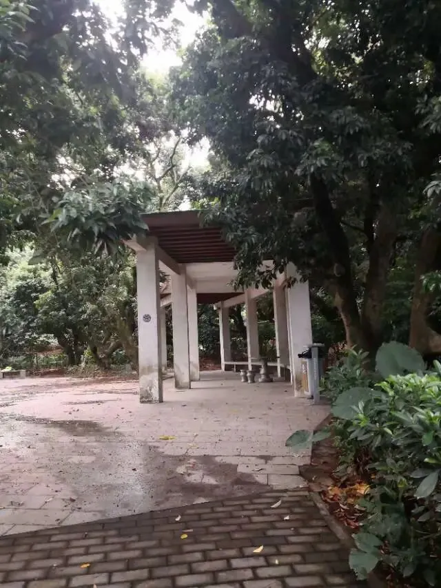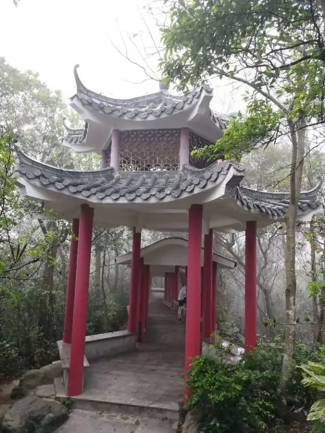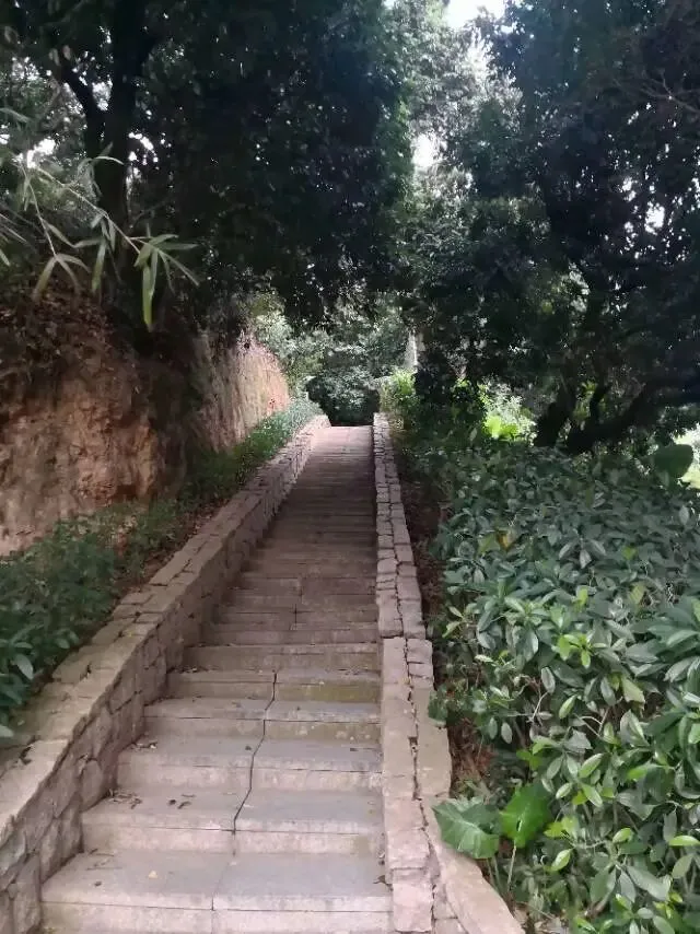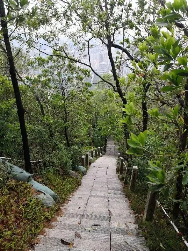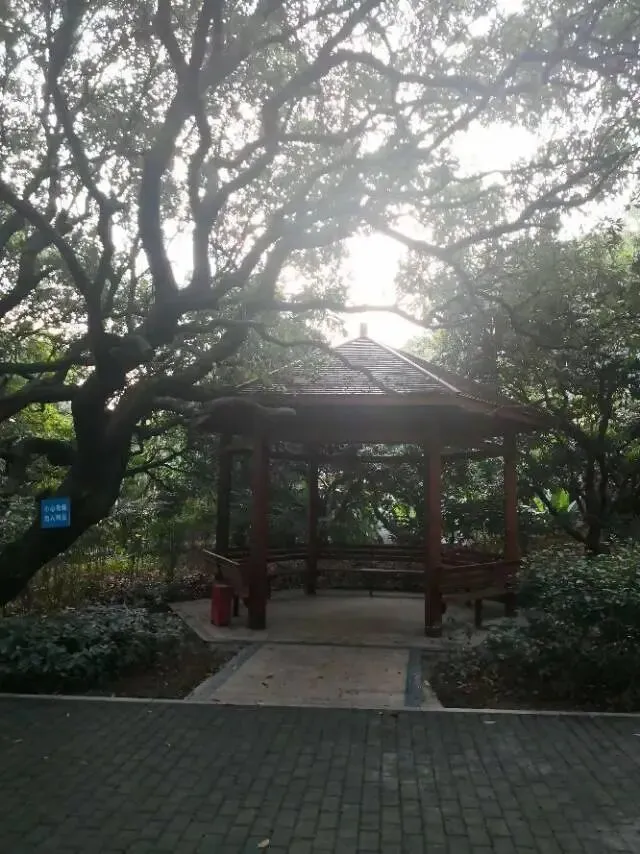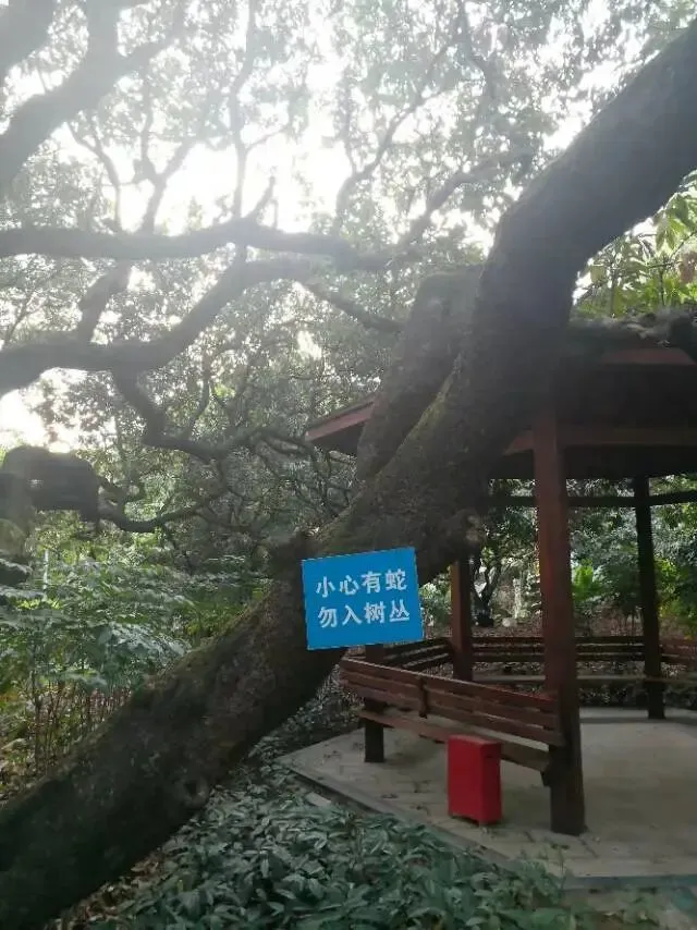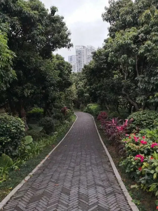 我是穿过荔林公园上山的。“日啖荔枝三百颗,不辞长作岭南人”。公园内植物种类繁多,尤以荔枝为主,浓荫蔽天,掩映成趣。道路阡陌纵横,曲径通幽,青砖铺就的健步道古朴雅致。一条细窄却相对平坦的柏油小路,作为自行车道却也让人赏心悦目。只是间或便能看到的“小心有蛇”的醒目牌,总是让人心有余悸、惴惴不安。