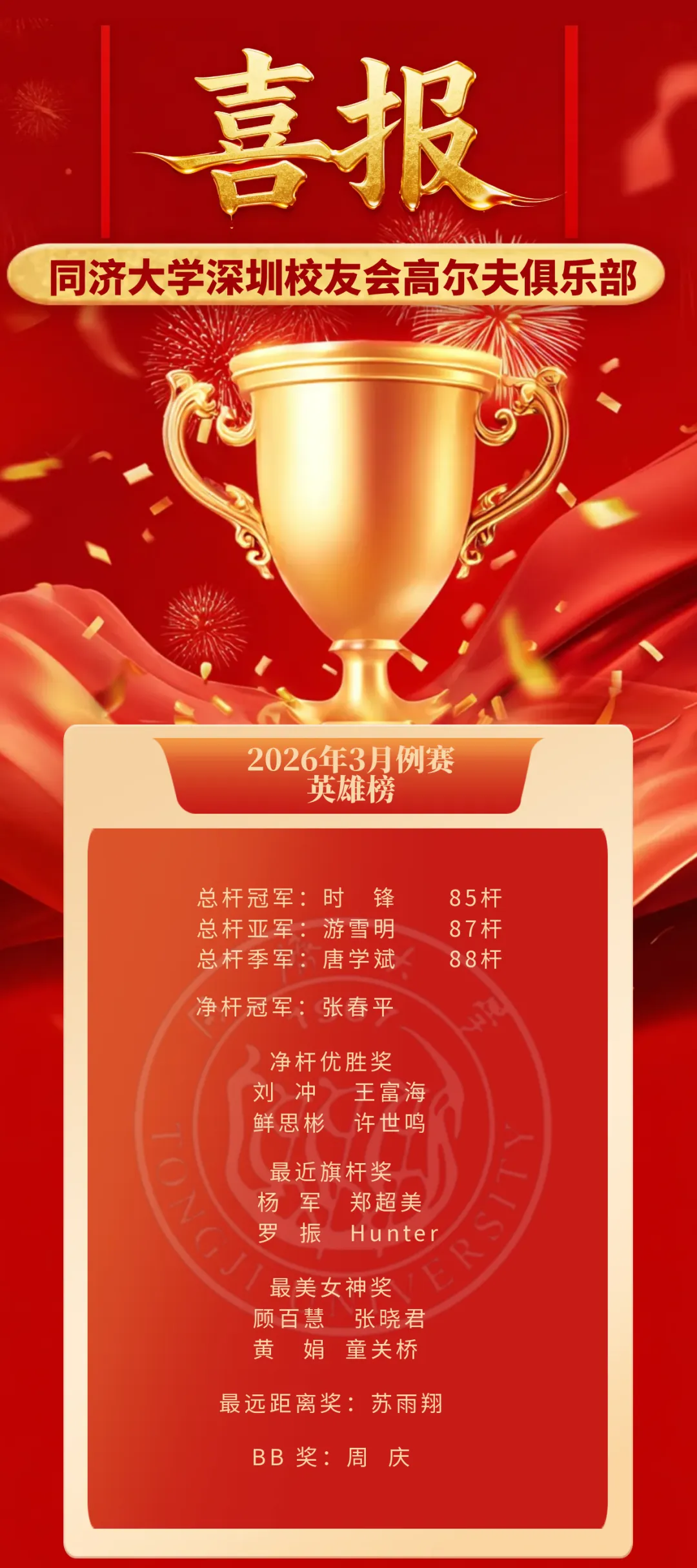 作为同济深圳校友高尔夫俱乐部2026年的开篇之作,本次3月例赛暨开年赛圆满落幕。赛事不仅为校友们提供了切磋球技、交流互动的平台,更彰显了同济人“同舟共济、追求卓越”的精神风貌 。俱乐部将继续以球为媒,凝聚校友力量,策划更多精彩赛事,让更多同济校友在绿茵场上共享高球之乐,续写同济深高校友俱乐部的新篇章。