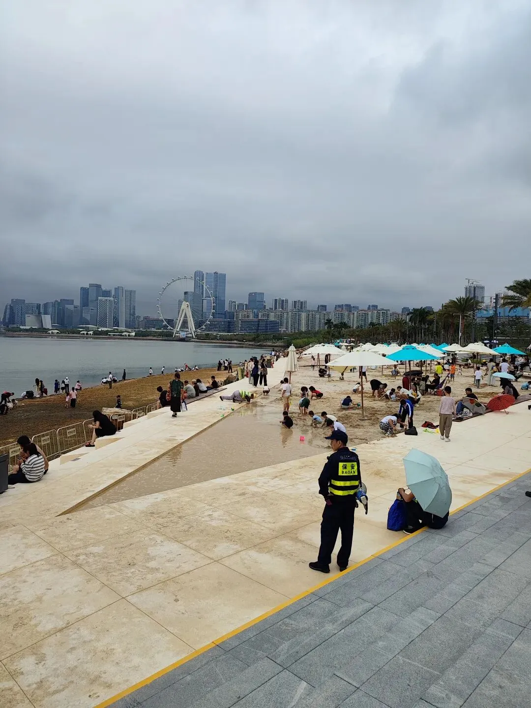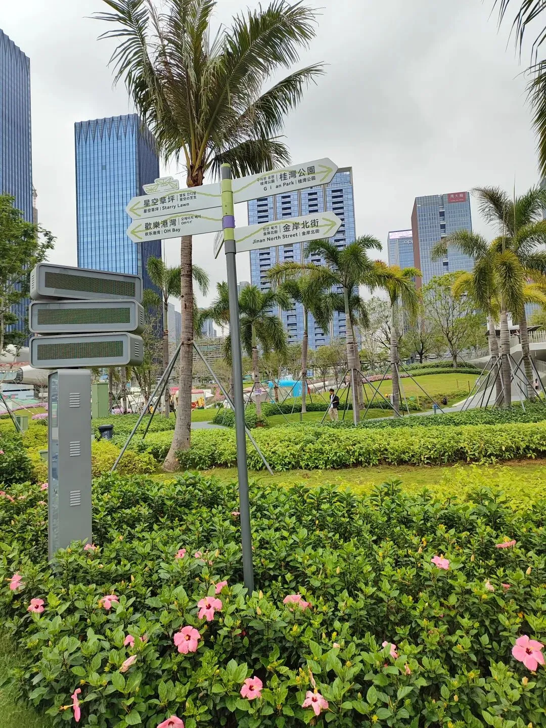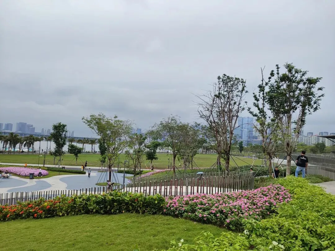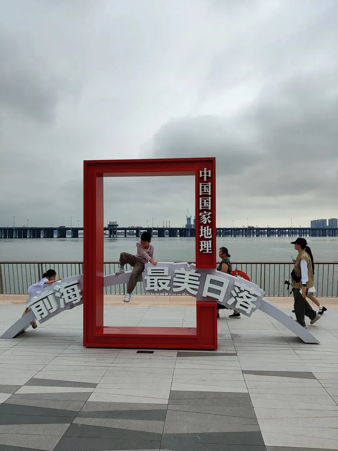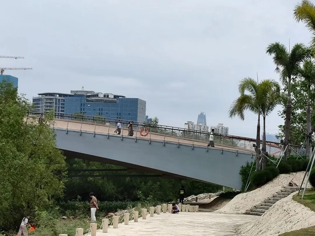 跨线桥,一边宝安区,一边南山区吗?是否以此桥分界管辖,没有细查。公园人流如织,和家人散步、观海、看夕阳,值得一玩。期待“奶龙”回归,孩子喜欢奶龙,为满足孩子愿望,过来一睹风采,失望没看到。