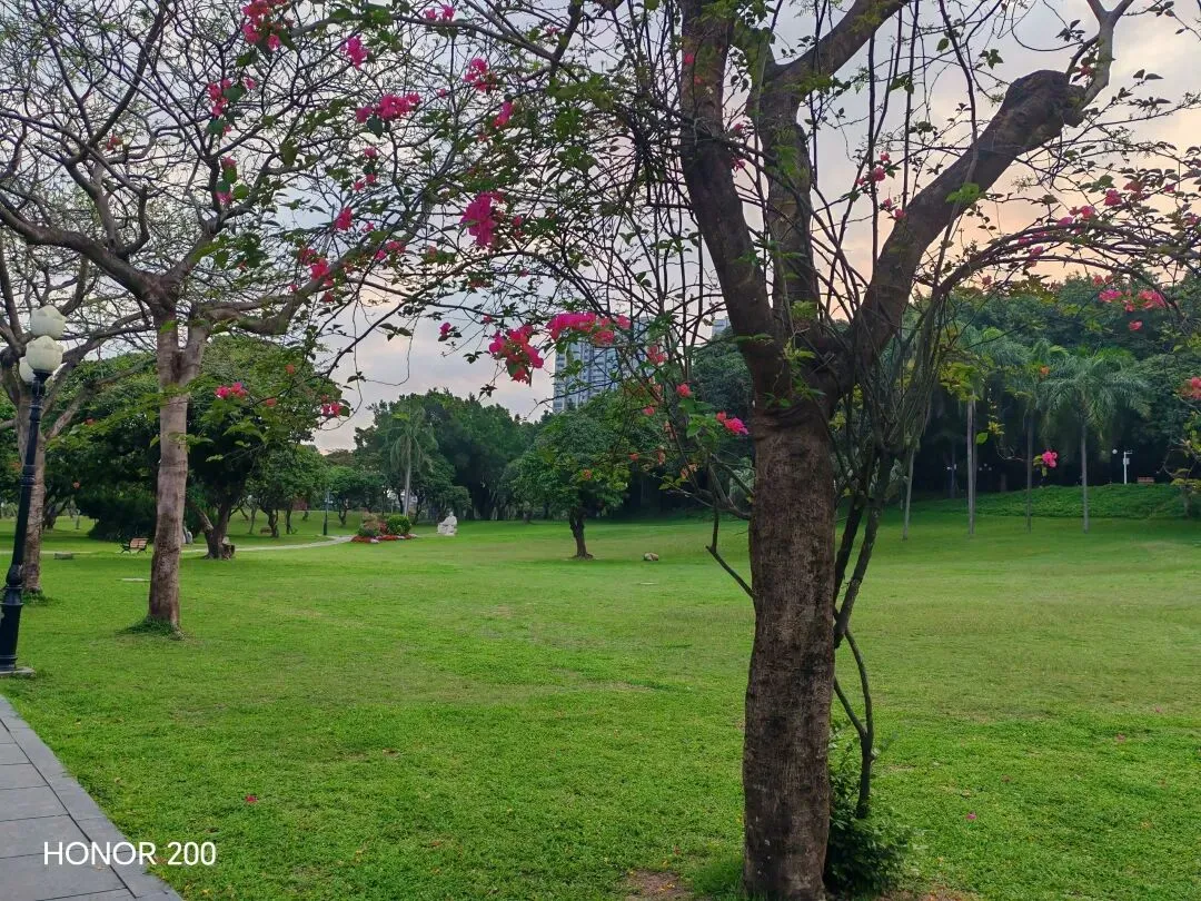 中山公园的绿草坪铺展眼前,开阔得仿佛望不到边,清风拂面,心旷神怡。健身器材顾及老幼,每棵大树下都安放着长椅,三角梅攀着树干缠绕生长,明艳又温柔。晨练的身影错落,鸟鸣与脚步声相融,浮躁的心在此刻全然安定。