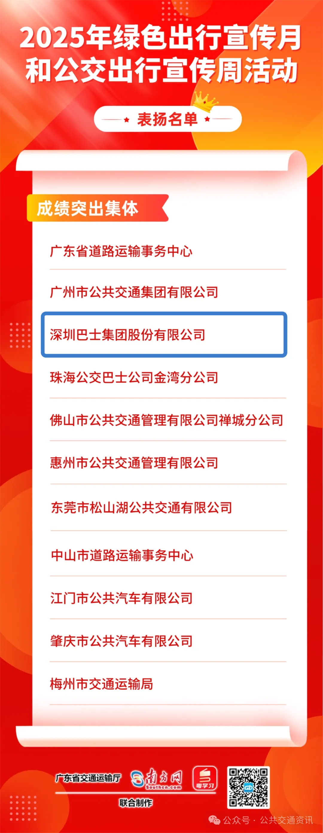 近日,交通运输部、公安部、国家机关事务管理局、中华全国总工会、共青团中央和中国残疾人联合会对在2025年绿色出行宣传月和公交出行宣传周活动中表现突出的集体和个人予以通报表扬,市属国企深圳巴士集团凭借扎实的服务成效、亮眼的绿色出行实践,获评成绩突出集体。