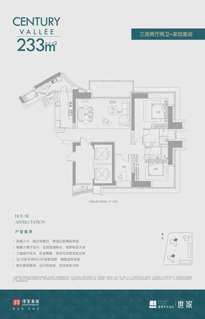 建面约233㎡三房两厅两卫+家政套间,客餐一体大横厅,贯通阳台,将首排景观面最大化,同时也优化了采光。