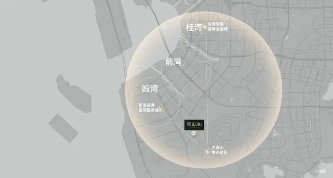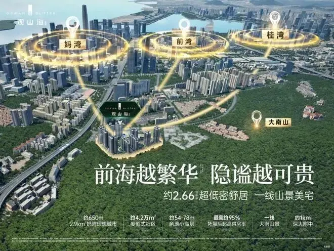 在区位上,项目毗邻大南山,属于南山中心区荔湾板块,靠近前海妈湾片区和蛇口片区;附近有妈湾在售的万科瑧湾悦价格在10.5万,以及即将入市新盘有妈湾的前海招商臻玺预计在10万左右,项目这两个项目观山海花园并不在妈湾核心位置,属于比较边缘地界了,后面入市大概率价格方便也会稍微比较低一些,项目相比于这两个小区优势在于景观背山面海以及大社区花园。