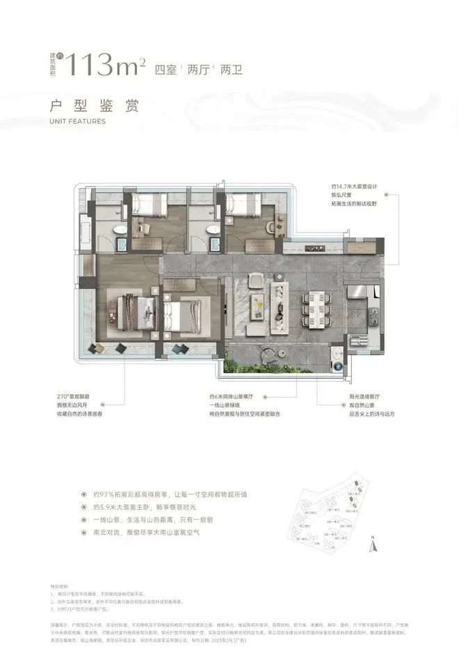 ⑥【一步到位性价比王牌 前海改善头等舱】4栋建面约138㎡奢阔山居范本:LDKB一体化,增配多功能厅、最大约15.5米南向四开间、约6m宽境阳台、主卧270°巨幕飘窗带独立卫浴及衣帽间、最高约94%拓展后综合使用率