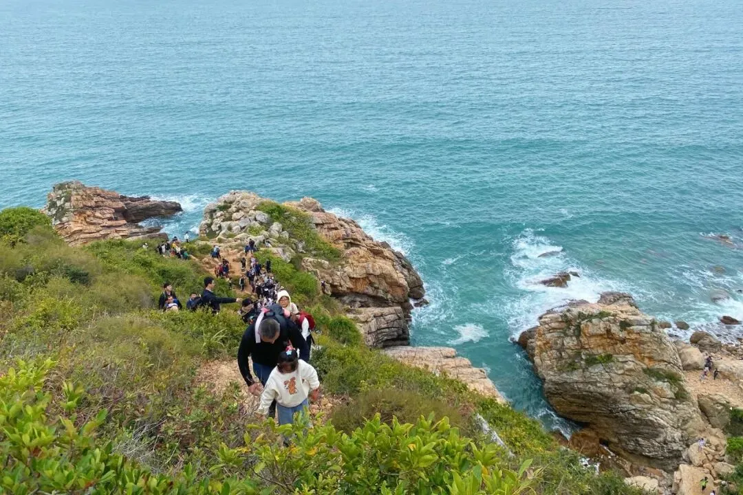 13:00 沿海岸线攀越山崖、踏过礁石,向西冲挺进(中途可坐快艇到西冲,费用自付 )徒步人多的时候可能会比较缓慢,大家要注意安全并礼让,团友们之间尽可能互相帮忙度过攀登的难点。