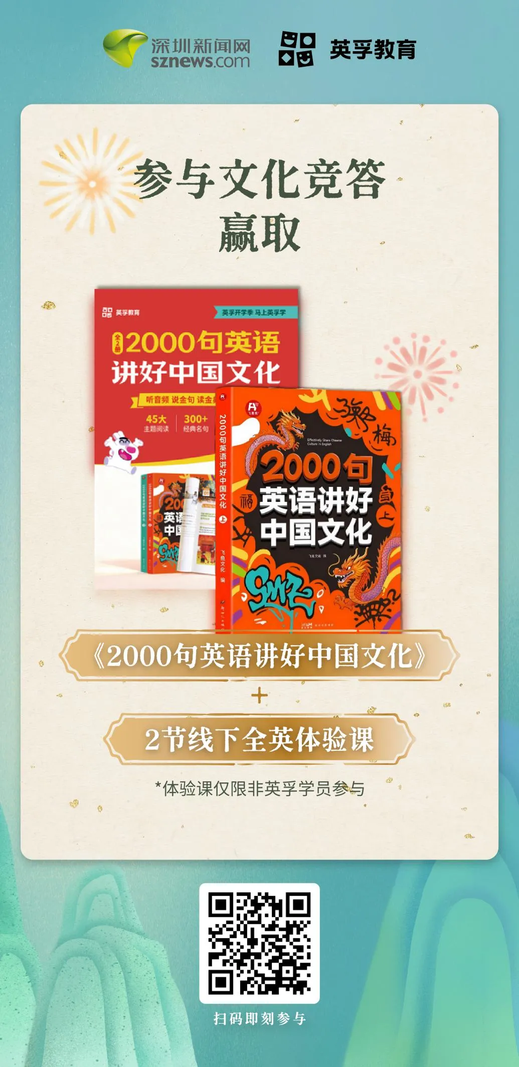 为丰富活动体验、普及文化英语学习,今年组委会特别上线“中华文化少年说·文化竞答”小程序,面向全体青少年开放趣味英语互动,让文化学习更轻松、表达练习更有趣。参与文化竞答,将有机会获得《2000句英语讲好中国文化》书籍包邮到家,及2节英语体验课程。(参与链接:https://jsj.top/f/GqrQlq)