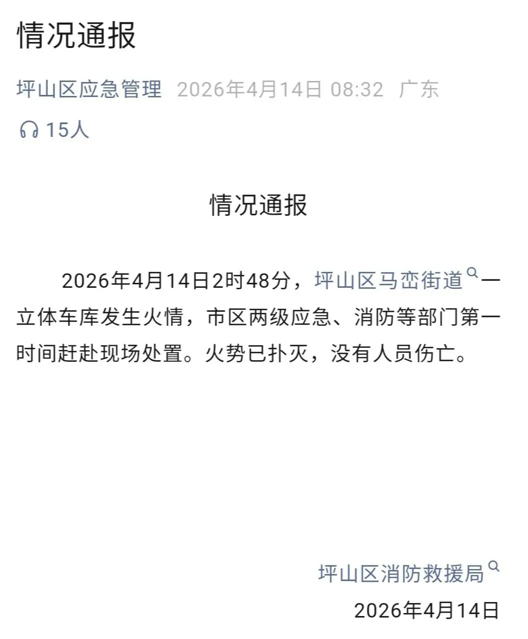 4月14日2时48分,深圳坪山区马峦街道比亚迪园区内一立体车库发生火情,现场冒出大量黑色浓烟。坪山区消防救援局发布通报:市区两级应急、消防等部门第一时间赶赴现场处置,火势已扑灭,无人员伤亡。