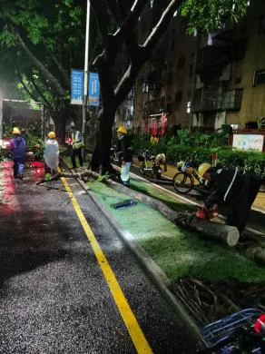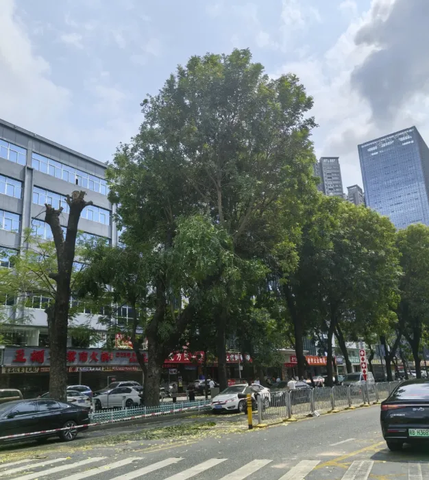 此外,城市道路两侧的树木,受地下管道、地下建筑的限制,根系一般只有四五十厘米深,横向伸展的范围也受到限制,容易造成树冠大、根系不发达的“头重脚轻”状况,有时候不得不进行重度修剪。深圳是个台风多发的滨海城市,每年需要对树木进行修剪,是防台风保安全的需要。