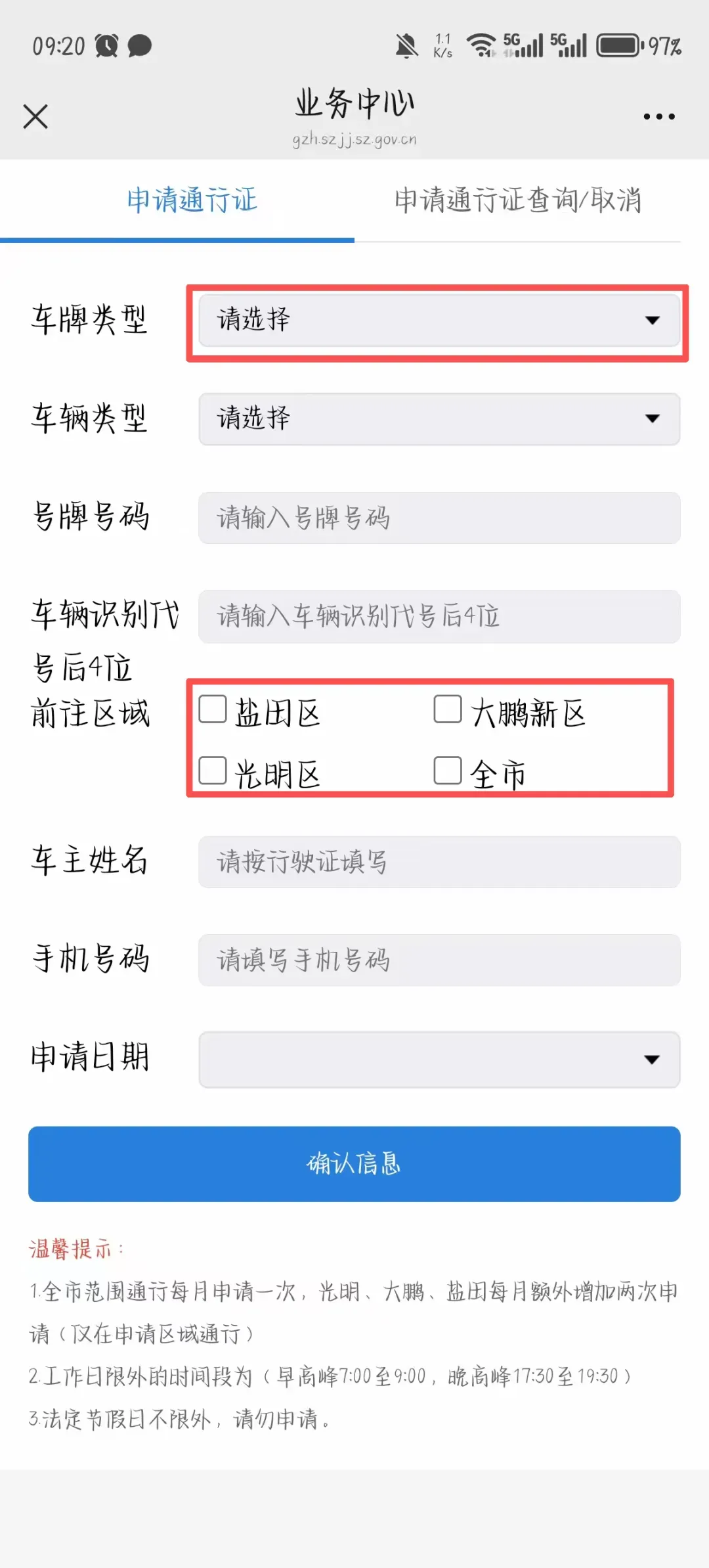 第二步:点击车辆选择,可以看到可办理通行的车辆。然后填写完成相关车辆信息,点击确认信息即可。